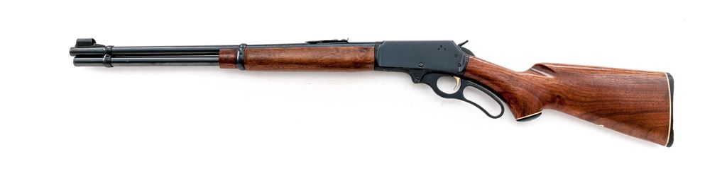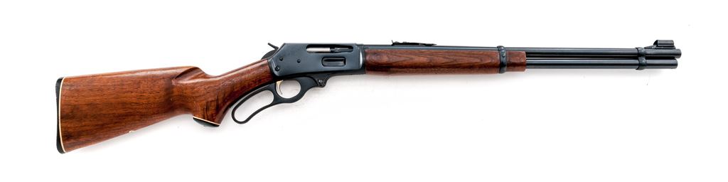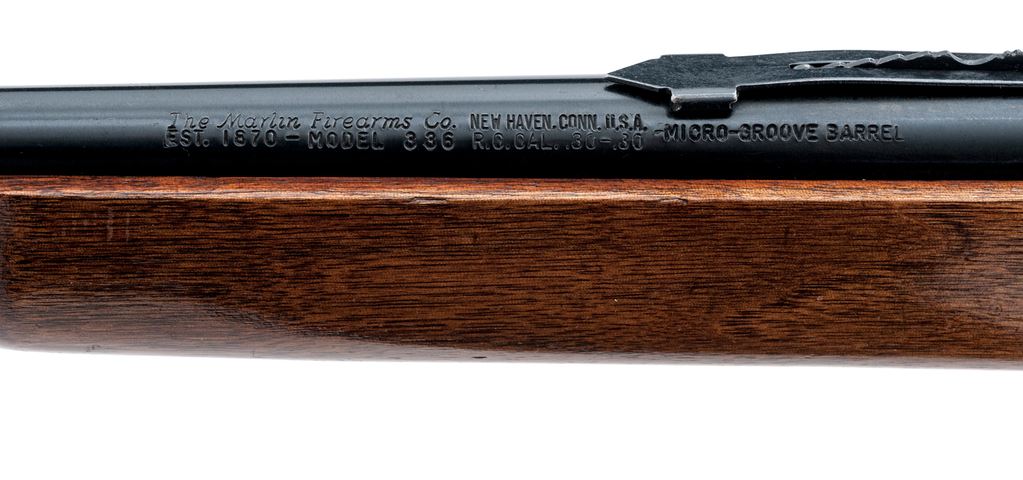 Marlin Model 336RC Lever Action Carbine, #AB64194, .30-30 cal., 20'' micro-groove ''JM'' marked barrel, blue finish, pistol-grip walnut stock and forend, with fluted comb, semi-gloss finish, and factory black plastic Marlin buttplate. Hooded brass beaded front sight, flat-top sporting rear sight with elevator, and gold-colored trigger. Top of receiver is factory drilled and tapped. Condition is very good retaining approx. 95% original blue, with scattered slight scratches on the frame and muzzle; lever with a little brown toning. Barrel address with crisp raised edges, one number in the serial is a little worn but visible. Stock retains most of an added semi-gloss varnish over general small impressions and normal handling marks and field wear. Crisp action, excellent bore with sharp micro-groove rifling. Mfg'd in 1966. Est.: $300-$500. (C&R)