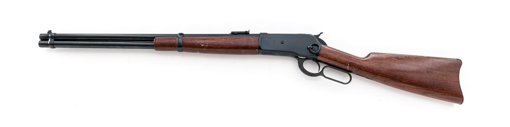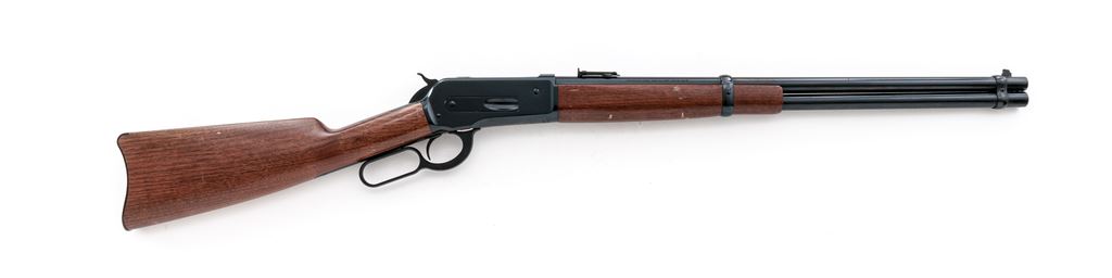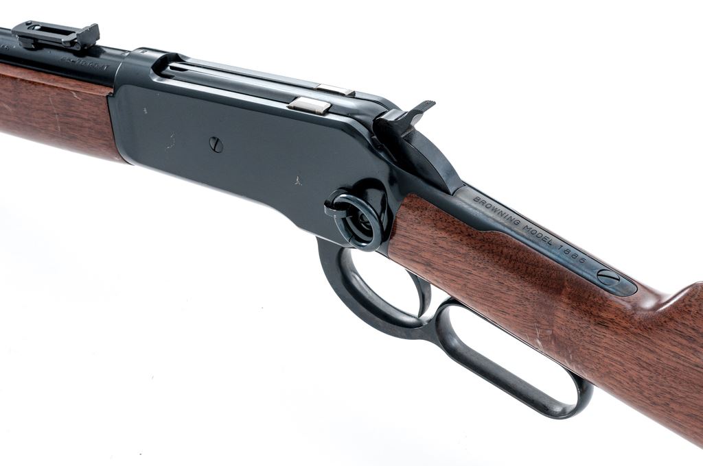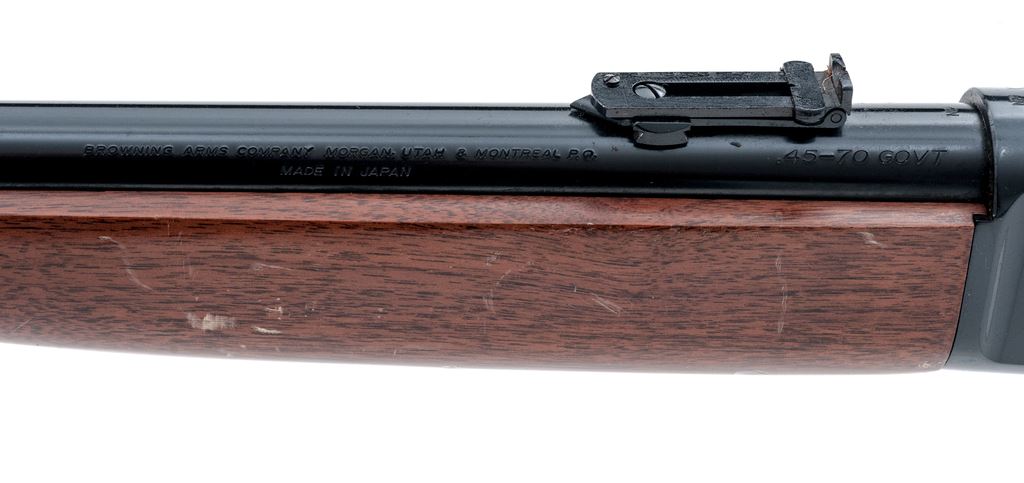 Browning Model 1886 Limited Edition Grade I Lever Action Rifle, #01620NY1C7, .45-70 cal., 22'' round barrel, blue finish, straight grip walnut stock and forend, with crescent steel buttplate, pinned blade front sight and folding ladder rear sight, with saddle ring. Metal rates as fine retaining approx. 97% original blue, frame with intermittent light scratches, factory lettering is clear. Wood is fair with dings and marks, most appear to be from poor storage; bottom of forend with a larger gouge. Crisp action, bright bore with excellent rifling. One of 7,000 rifles produced for one year, 1986. Made in Japan. Est.: $700-$900. (Modern)