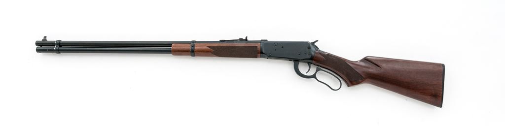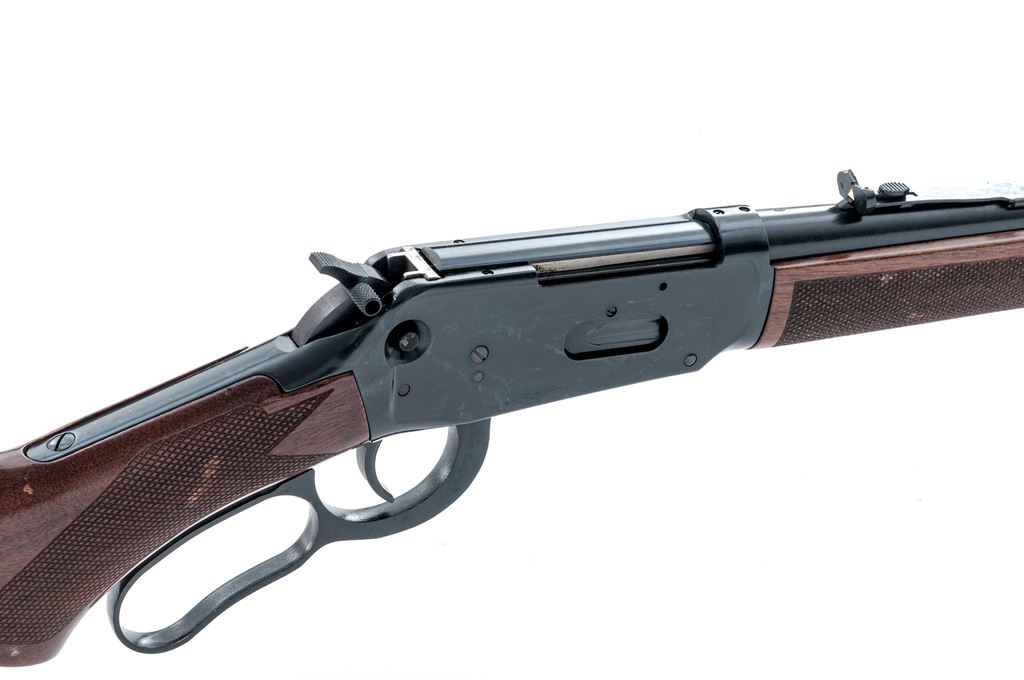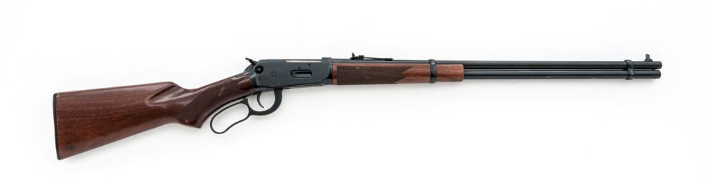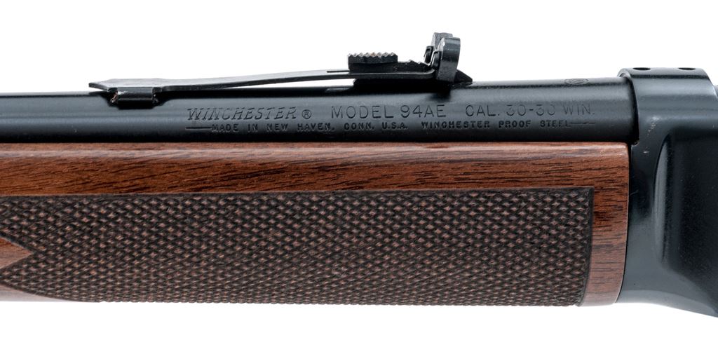 Winchester Model 94AE Lever Action Rifle, #6362896, .30-30 cal., 24'' barrel, blue finish, checkered pistol-grip walnut stock and forend, black composition Winchester buttplate, with tall blade front sight, sporting rear sight with elevator, hammer extension, and cross bolt safety. Metal surfaces are in fine overall condition with approx. 97% remaining original finish; barrel and magazine tube with intermittent moderate scratches and handling marks; left side of frame with a few spots of edgewear. Wood is fair; right side of wrist is cracked above the checkering and even so feels solid. Both the stock and forend with pressure dents and scratches, some of which occurs in the checkering; edge of buttstock is a little rough where it meets the buttplate with some flaking and a cracked surface layer that remains intact. Crisp lever action, bright bore with excellent rifling. Est.: $200-$300. (Modern)