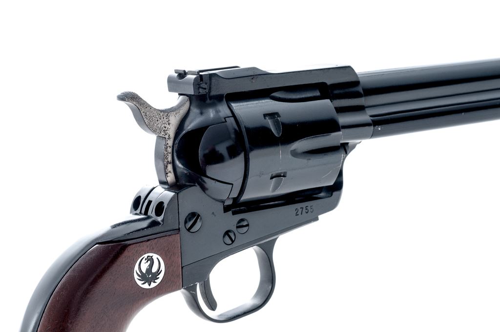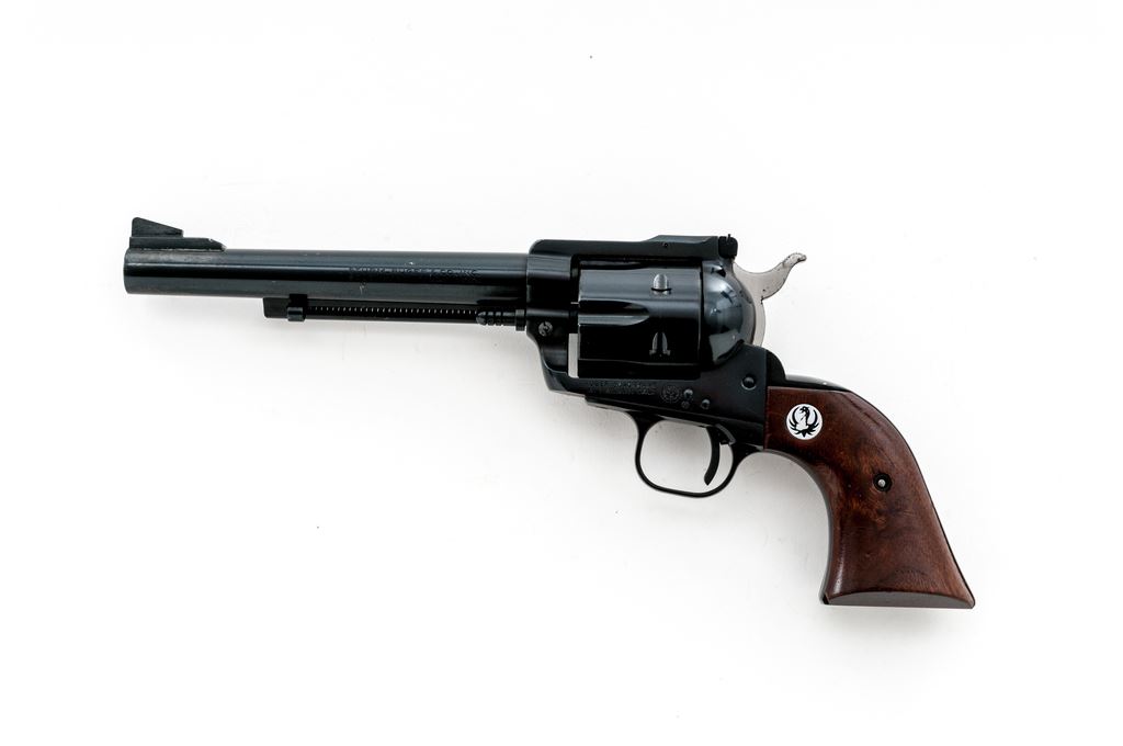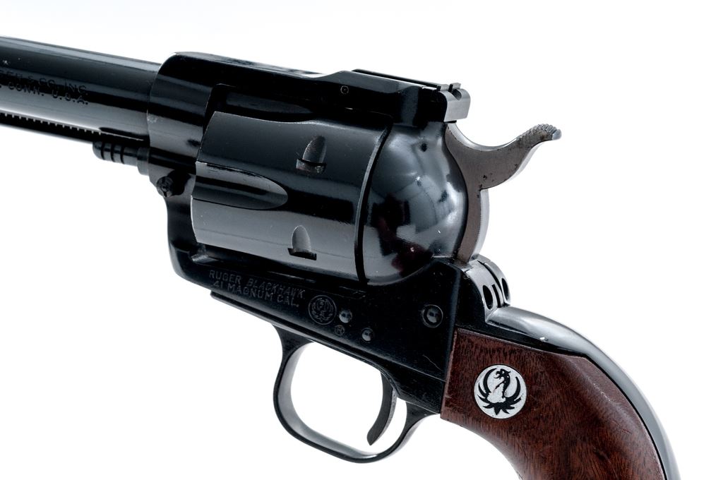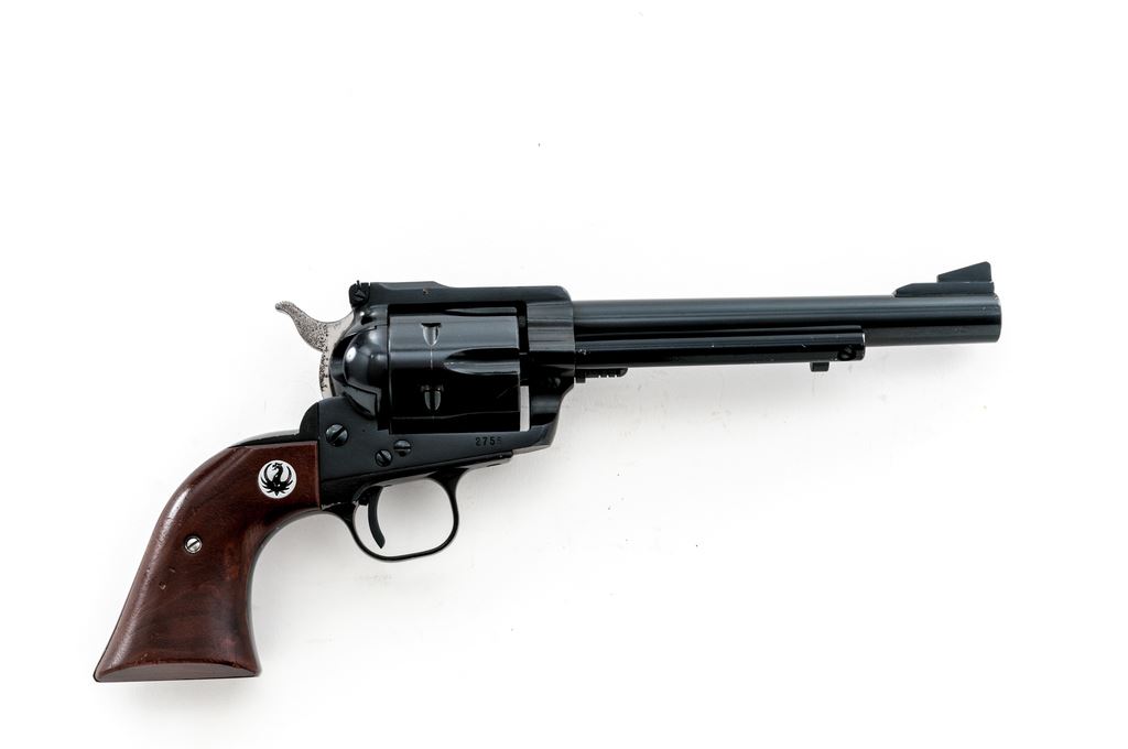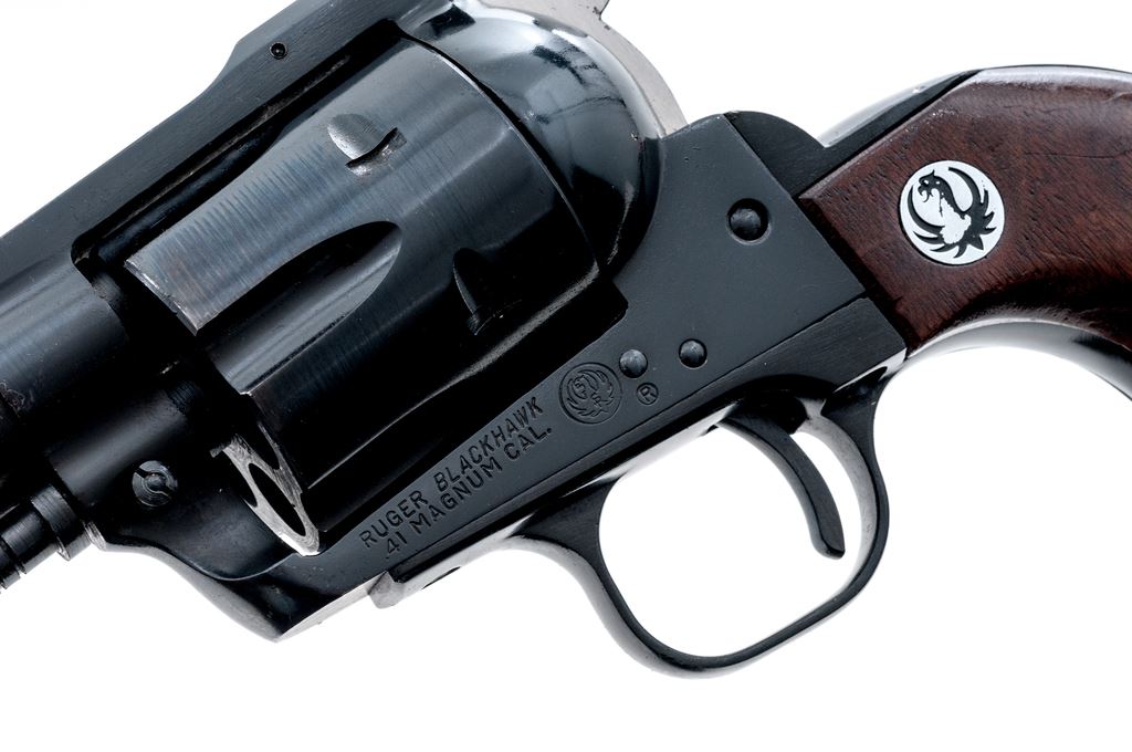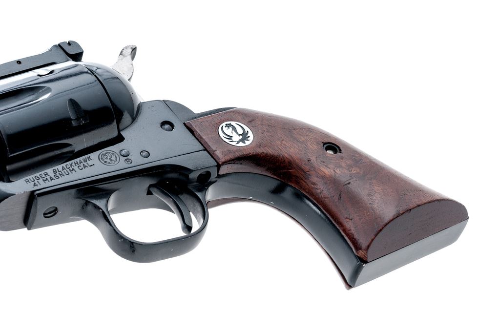 1st Year Ruger Old Model Blackhawk Single Action Revolver, #2755, .41 Mag. cal., 6-1/2'' barrel, blue finish, smooth walnut grips with Ruger ''black eagle'' medallions; standard sights include a blade front and fully adjustable rear. Mfg'd 1965. Condition overall is very good retaining approx. 97% original finish, metal with scattered small surface nicks and scratches, cylinder with a thin index line. The right upper edge of frame with a small spot of fine pitting, right side of the hammer is lightly pitted overall. Grips with shallow scratches and small impressions. Good smooth action, bright bore with excellent rifling. Est.: $400-$600. (C&R/PPT)