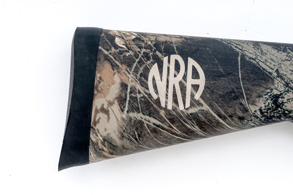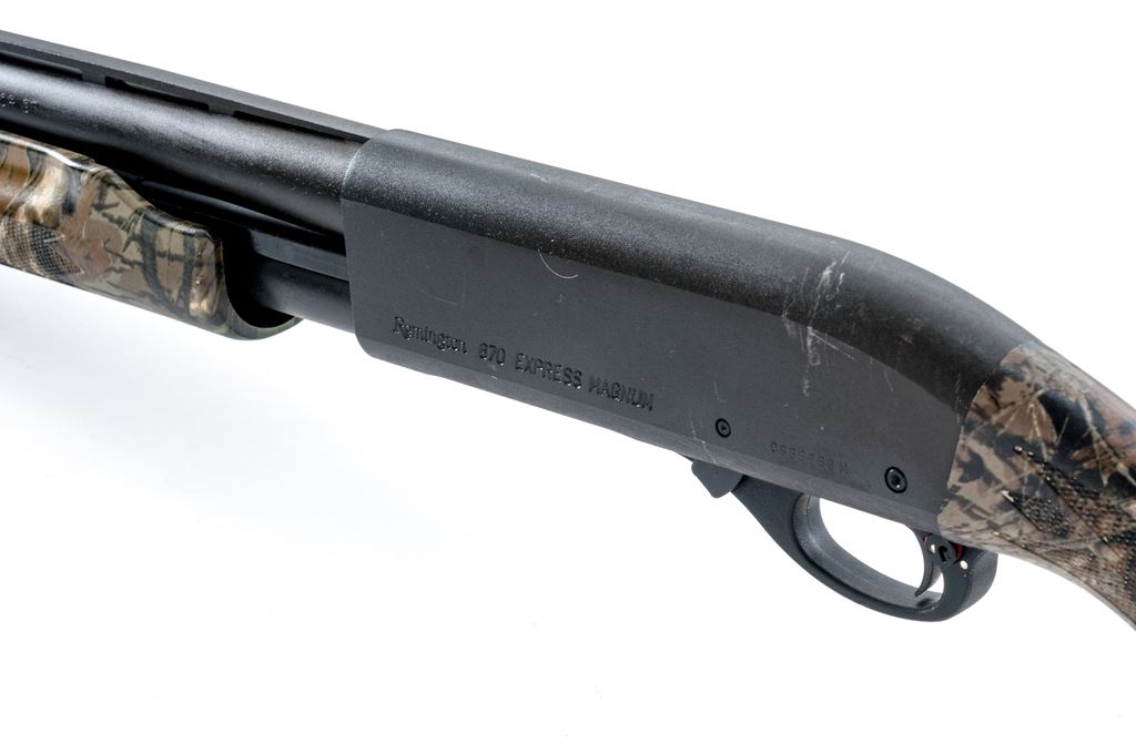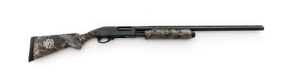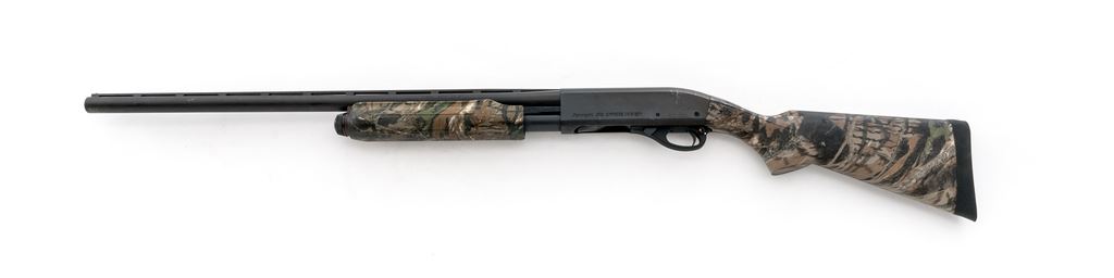 Remington 870 Express Magnum Pump Action Shotgun, #C986766M, 12 ga., 26'' vent rib barrel with silver bead front sight, 3'' chamber, internal screw in Mod. choke; metal with a matte finish. Checkered pistol-grip synthetic stock with camouflage pattern, black rubber Remington recoil pad; right side of buttstock is marked ''NRA''. Metal rates as very good with some scuffs to the matte surfaces; receiver with a little speckled oxidation. Stock is near excellent with a only a few light handling marks; left side of buttstock with one small chip to the camouflage finish. Crisp action, excellent bright bore. Est.: $150-$300. (Modern)