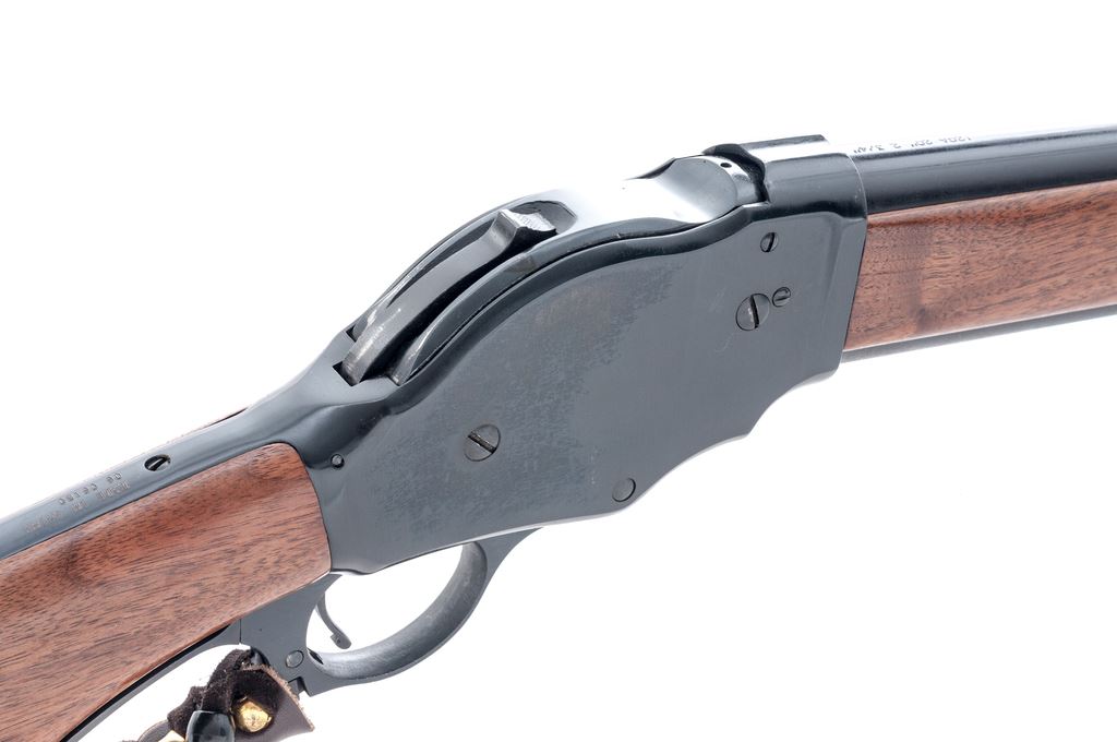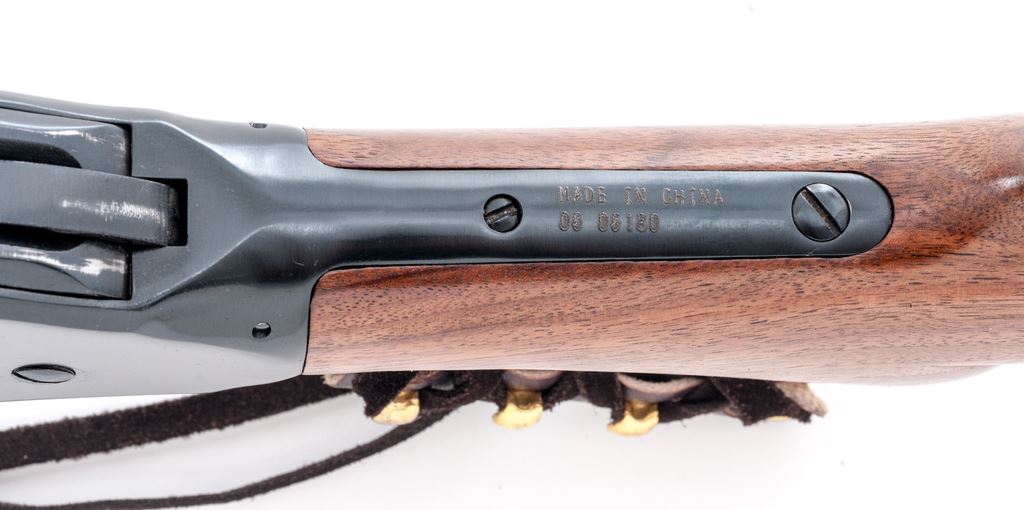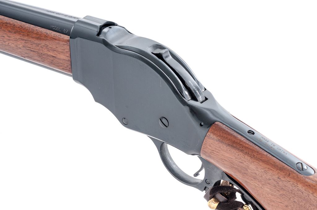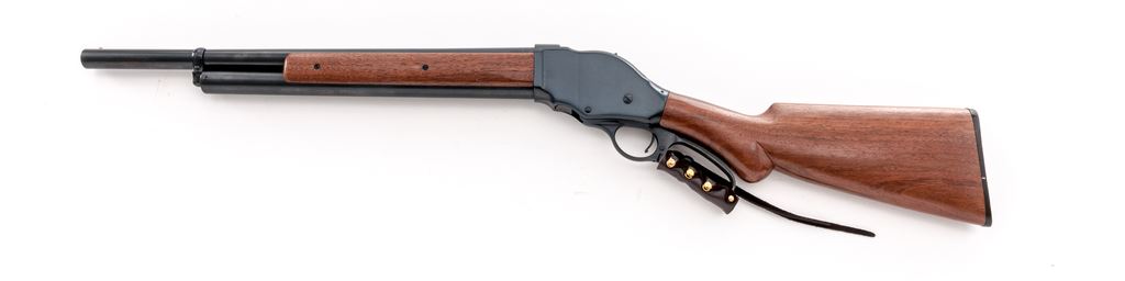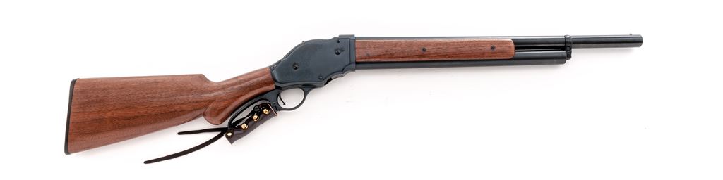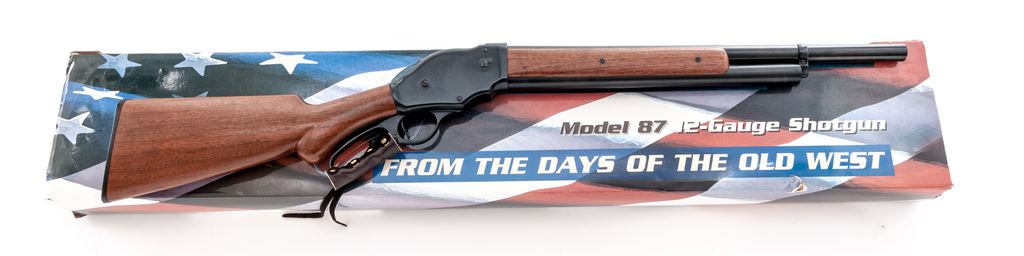 Interstate Arms Corp. (IAC) Model 87 Lever Action Shotgun, #0606180, 12 ga., 20'' barrel with brass bead front sight, 2-3/4'' chamber, CYL bore; round knob pistol-grip walnut stock and forend, with checkered black plastic buttplate. Lever is decorated with leather wrap. In original box with matching end label. Made in China. Condition is excellent retaining approx. 99% original blue and the metal appears as new. Wood is near excellent with scattered light handling marks. Crisp action, bright bore. Patterned after the Winchester Model 1887 shotgun. Est.: $250-$400. (Modern)