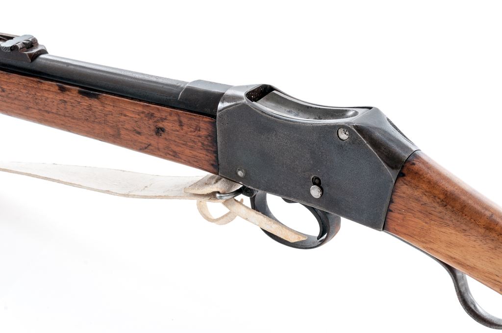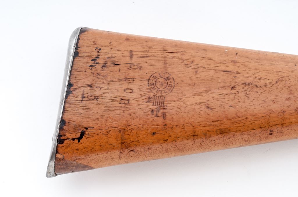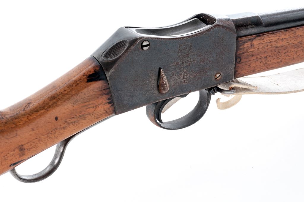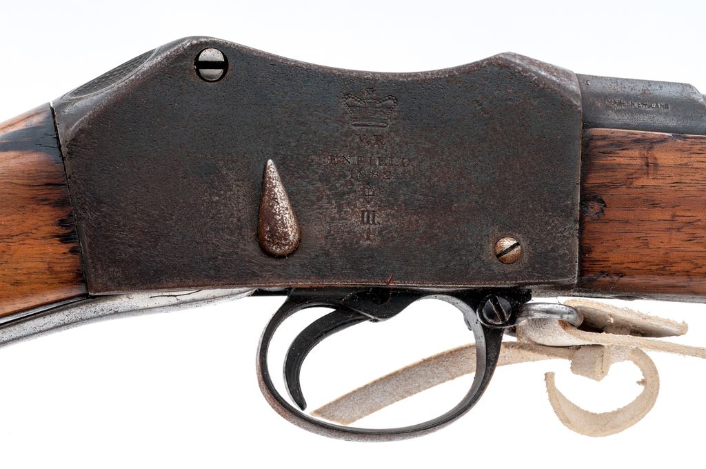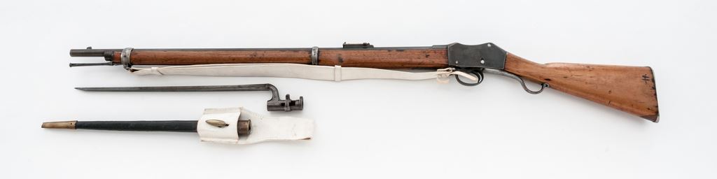Antique British Martini-Henry Mk III ''Short Lever'' Service Rifle, by Enfield Arsenal, with bayonet and sling, NVSN, .577/450 cal., 33'' barrel, with block-blade front and sliding-leaf rear sights, marked with numerous proofmarks including the ''(broad arrow)/WD'' at breech; receiver with distinctive ''thumbprint'' on top-right, has the same and additional marks at left-side juncture with barrel, and a large ''(crown)/V.R.'' over ''Enfield./1882'' over ''(crown)/V'' over ''III/L'' on right side; serpentine lever when lowered opens the dropping-block action for cartridge loading/extraction/cleaning; two steel barrel bands (both with ''(broad arrow)/WD'' proofmarks, the top band with arrow-shaped side bayonet lug and sling swivel); iron nosecap and slotted, button-tip ramrod. English hardwood stocks bear various marks including a circular Enfield cartouche and ''500R'' on right-side butt. Condition is good: the barrel, receiver and triggerguard retain approx. 50% deep black-blue, which is likely an arsenal refinish over scattered light pitting and rust; lever, buttplate and bands (all having ''(broad arrow)/WD'' proofmarks) are ''arsenal bright''. Stocks are sound with clear markings, have the expected dings from military use, a 1''x1/2'' wood patch at butt, a likely later coat of thin varnish, and a pleasing light color. Action is strong; bore is clean with deep rifling. Bayonet (with various marks at ricasso) shows cleaned light pitting; leather scabbard is sound with scattered age cracking; buff leather sling and bayonet frog are modern reproductions. Entering service in 1871 after replacing the Snider-Enfield, Martini-Henry variants served throughout the British Empire for the next 47 years. Est.: $500-$700. (Antique)
