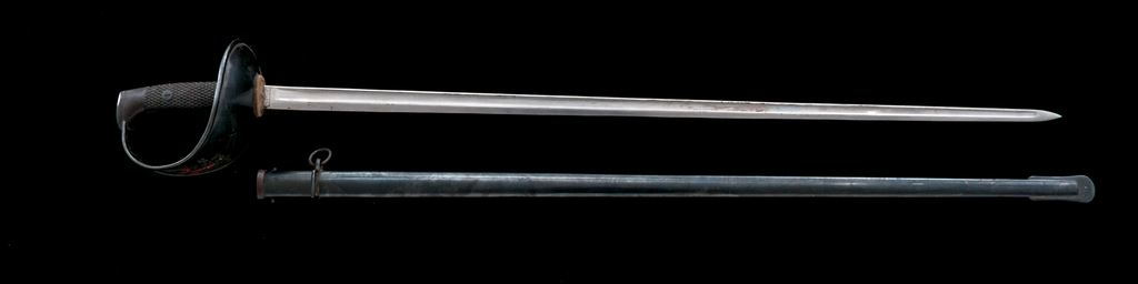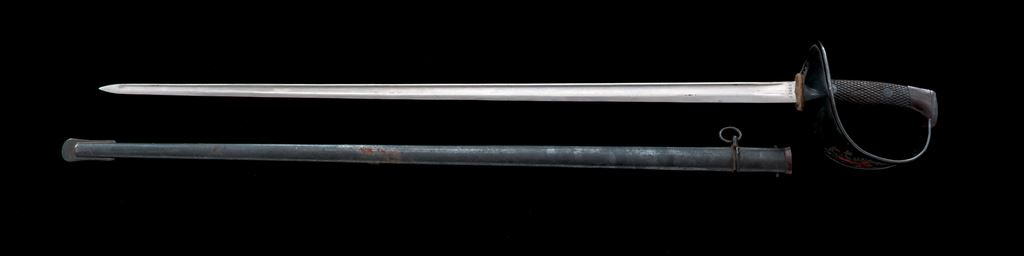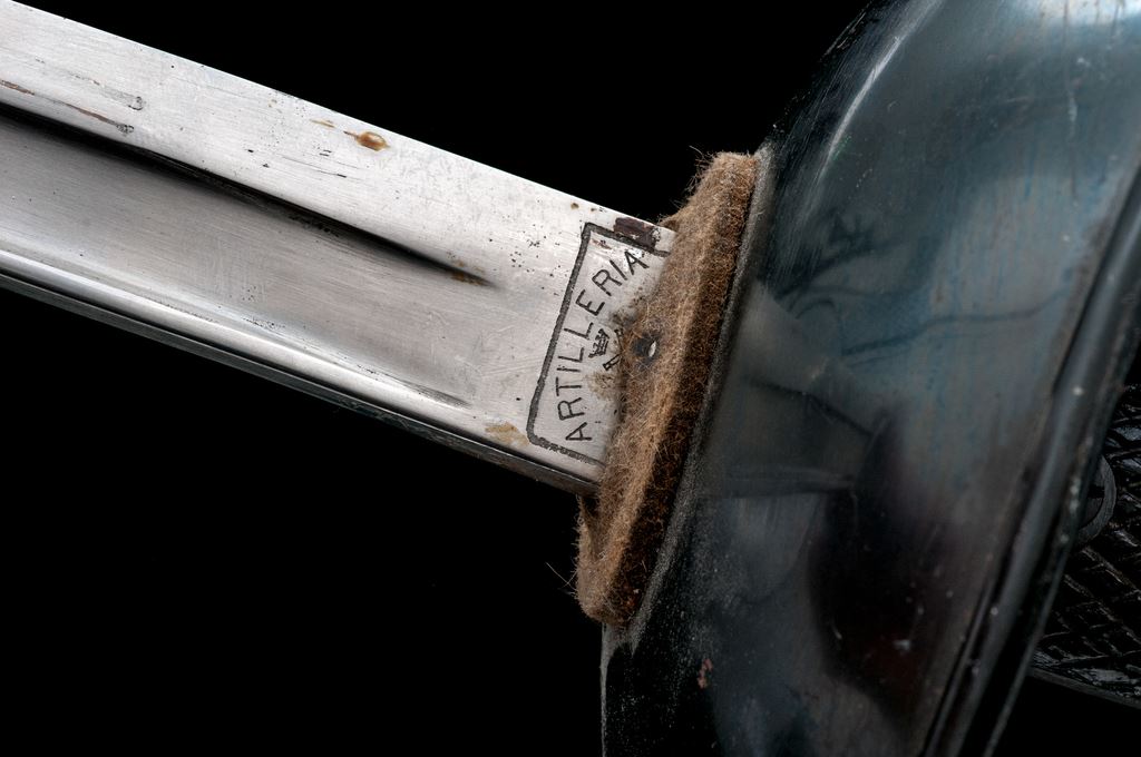 Spanish Enlisted Man's Artillery Sword. Nice Spanish enlisted man's artillery sword with scabbard. The 35'' bright steel blade is straight with a wide fuller for almost the entire length. It is marked at the ricasso ''Artilleria'' with a crown logo, serial number on the other side, and ''Spain'' on the top spine. The original felt blade washer is present. The cupped steel guard is beautifully polished and blued with an eagle, cross, and crown etched engraved in the metal. Grip panels are black painted checkered wood, with screw retainers. Pommel is blued steel. Scabbard is blued steel with one hanging ring. OAL is 43''. Condition is very good with the blade in original factory polish with some old grease residue. Guard shows light scuffs and scrapes on the outside with light scattered rust at the top. Inside of the guard has scattered rust spots overall. Grip panels are very nice with most of their painted finish intact. Pommel and backstrap have light rust spots, that may clean up nicely. Scabbard has light rust spotting overall, that may clean up well, with one area of heavier rust. Est.: $150-$250.