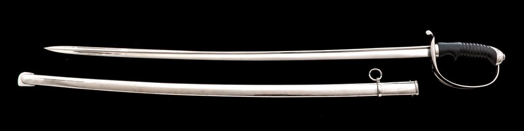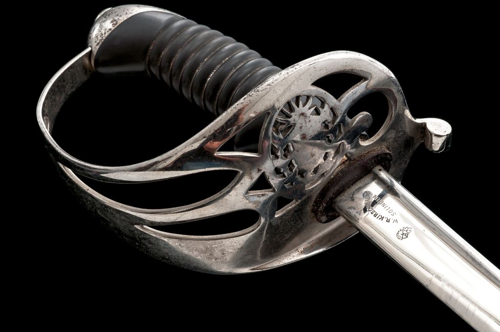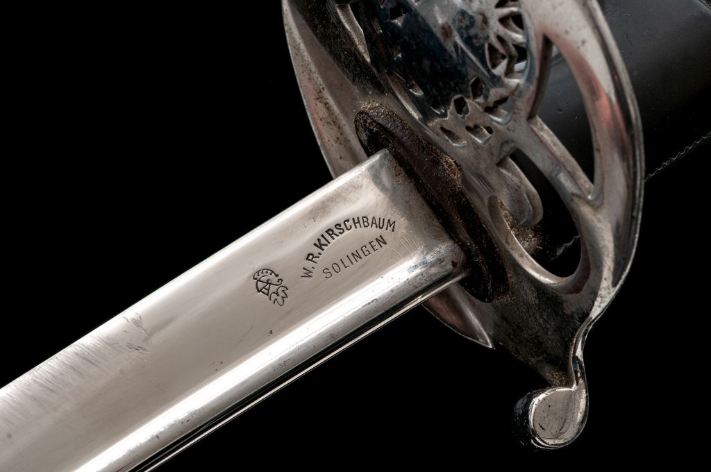Nice Early Argentina Officer's Dress Sword, made in Germany. The 32-3/4'' bright nickel-plated blade is a quill back shape, with a maker's mark near the bottom of ''W.R. Kirschbaum, Solingen'' and a knight's head stamp. The original leather blade washer is present. The pierced guard has the outline of the Argentine crest. Handle is a black composition material with a finger and thumb rest, and grooves in the upper section. Pommel is nickel-plated steel. Scabbard is nickel-plated steel with one hanging ring. OAL is 39-3/4''. Condition is very good with the blade having a nice bright smooth finish with just a few light scuffs. Guard and pommel have a few very minor spots of light rust showing through the nickel plating, with some losses to the finish on the pommel. Grip is very nice with no cracks or chips. Scabbard shows some scattered rust coming through the nickel finish that may clean up better, and the normal scuffs and scratches from use. Est.: $250-$450.