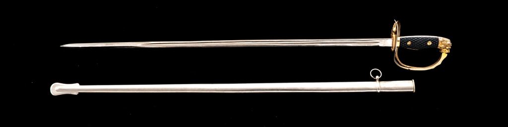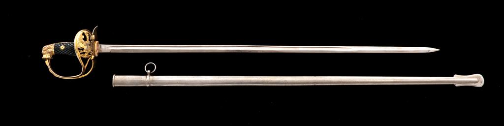 Nice Franco Era Spanish Officer's Lion's Head Sword, with scabbard. The 30-1/4'' bright nickel-plated blade has one wide fuller and is double edged about 9'' from the tip, marked at ricasso ''Toledo Spain''. The original felt and leather blade washer is present. The pierced guard has the Spanish eagle and cross in relief with two branches. Grip panels are checkered black plastic with retaining screws. Scabbard is nickel-plated steel with one hanging ring. OAL is 37''. Condition is very good, the blade having a slight haze of oxidation that should clean nicely. Guard shows slight wear to the gold finish with a tight crack in one of the branches. Grip panels are in very nice condition. There is wear to the gold finish on the top of the lion's head and the sides of the grip area. Scabbard has a haze of oxidation overall, with some scattered spots of rust that may clean up nicely. Est.: $75-$150.