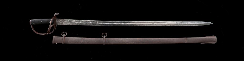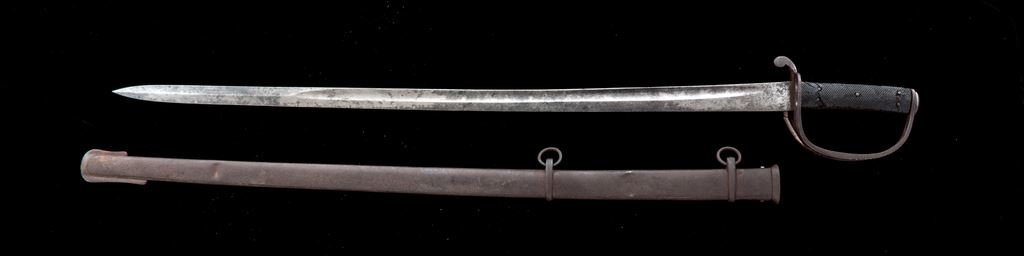 British Model 1853 Enlisted Cavalry Sword, the type that saw use in the Crimean Campaign in 1855 and were imported for use in the U.S. Civil War by both sides. The unmarked 35.25'' blade has a wide single fuller and is double edged for about 12'' near the tip. Iron three-branch guard with quillion, and riveted checkered leather grip panels on the through tang handle. Steel scabbard with two hanging rings. OAL is 41.75''. Condition is good, the blade having age graying and rust stains, with brighter areas showing through; no edge nicks or heavy pitting. The outer branch of the guard is broken, and there is a heavy pitted rust patina to the guard and pommel. Leather grip panels show age and scuffing, with a crack on one side. Scabbard has several dents and a dark pitted rust patina overall. Est.: $500-$700.