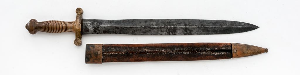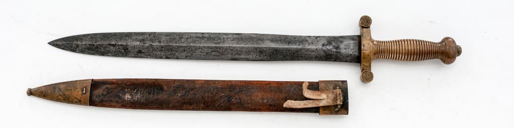 French Model 1831 Artillery Short Sword, with leather scabbard, styled after the Roman gladius sword, it features a double-edged blade with central spine measuring 19.25'' in length. Heavy brass handle with crossguard has concentric rings in the grip area; quillions on the guard also feature concentric circles. Several small arsenal stamps are located on the underside of the crossguard. Leather scabbard with brass fittings. Condition is good with age graying, light rust, and pinprick pitting over the blade surface. Nice patina to the brass handle. Scabbard shows much age to the leather, with some losses to the stitching on the back side, and the tip area is weak. Brass fittings on the scabbard show a dark patina, small dents, and scrapes. Overall length is 25-3/8''. Est.: $250-$400.