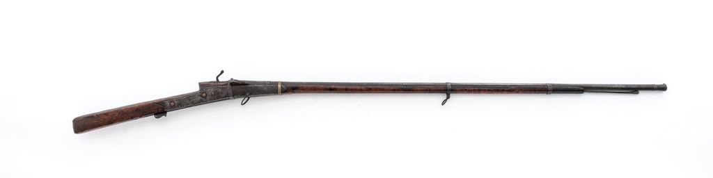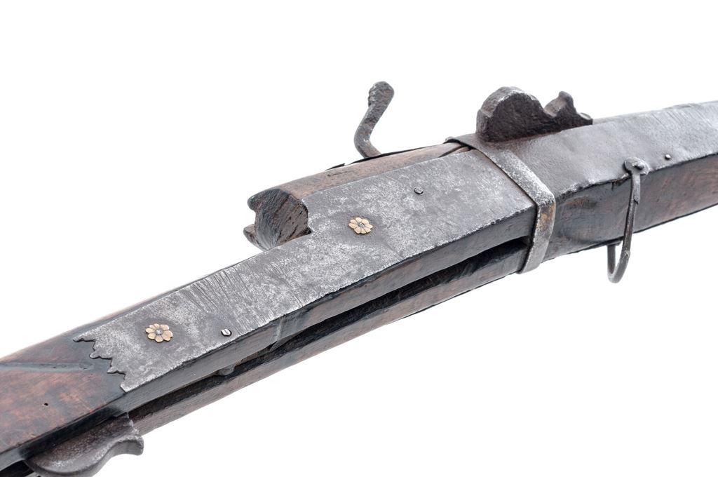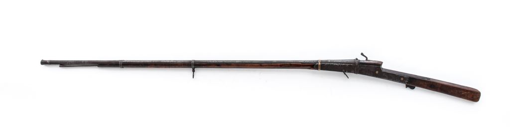 Antique Indian Toreador Matchlock Musket, in approx. .45-50 cal., with flared muzzle that measures about .620''. Barrel is 50.75'' long with narrow brass bands inlaid at the muzzle and breech area, and round copper front sight and ''V'' groove rear sight. The long-length wood stock has two iron barrel bands in front, brass band at the front of the breech, and large iron band at the rear of the breech. Iron side panels reinforce the stock at the breech and are retained with rivets, two of which have copper flower decorations on either side. The match lever and trigger assembly function properly. There are sling loops at the center band and middle of the breech area, with iron loading rod under the barrel. Condition is good with a dark rust patina and light pitting on most all of the metal surfaces. There is some evidence of cleaning to the metal work in a few places. Stock has a nice dark patina with numerous dent, dings, and minor losses to the wood. OAL is 69''. Est.: $350-$650.
