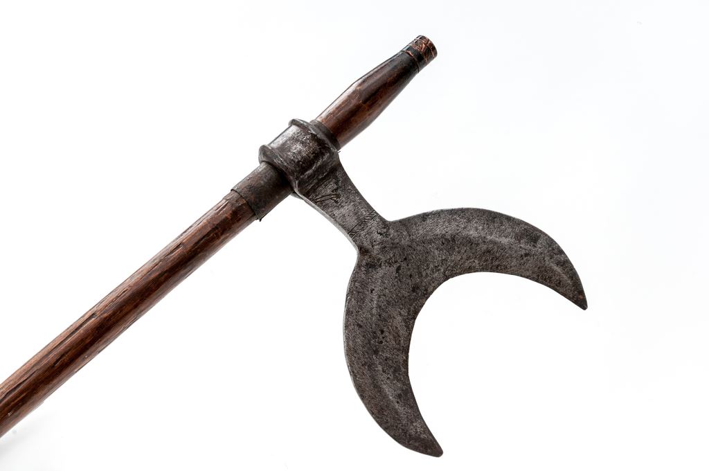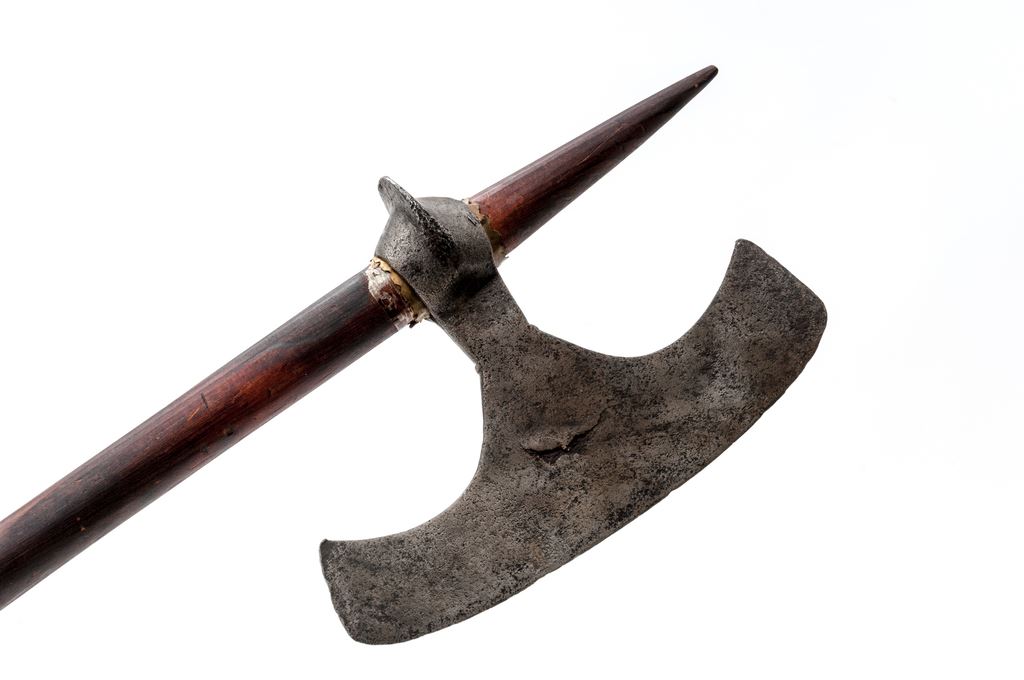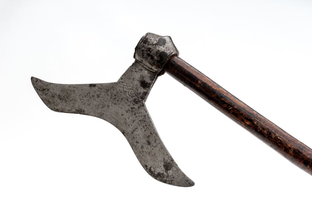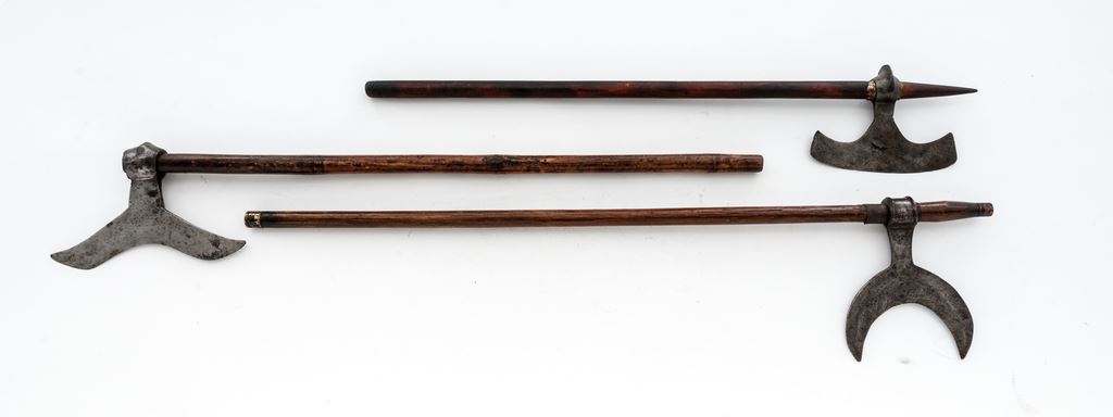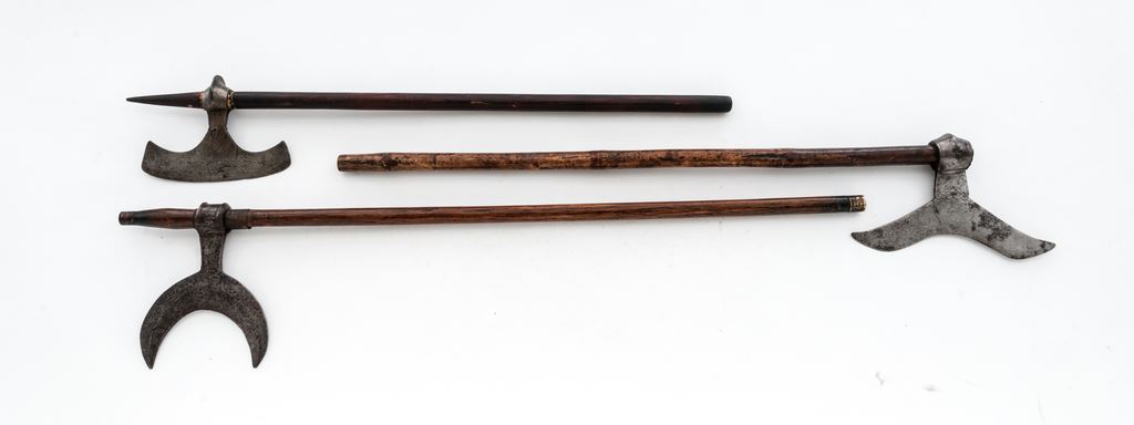 Lot of 3 Indian ''Bullova'' Axes, from the Chota Nagpur area of India, with different shaped axe heads: (1) The first is a 6-1/4'' wide ''W''-shaped blade with a forged eyelet for mounting. The 26''-pointed round wood shaft has a dark finish. There is a thin brass sheet with scalloped edges that helps retain the axe head. Condition is good with the axe head showing forging flaws, rust pitting, and a dark age graying. Wood shaft may be a modern replacement and shows a few scratches and dings. (2) The second axe has a moustache-shaped blade, sharp on the outer edge, that measures about 8-1/2'' wide. It has a hand forged eyelet for mounting, and has some light engraved decorations near the middle. Round wood shaft measures 27'' in length. Condition is good with the blade displaying some forging flaws, mainly on one side, and some scattered light rust pitting. Wood shaft shows age, scuffing, and some longitudinal cracks. (3) The third axe has a half-moon shaped blade measuring 5'' wide with a hand forged eyelet for mounting. The 31'' round wood shaft has brass reinforcing rings at the top and bottom. Condition is good with the blade showing evidence of hand forging, dark age graying, and light rust patina. Wood shaft has a dark patina and a few scuffs and scratches. Est.: $300-$500/lot.