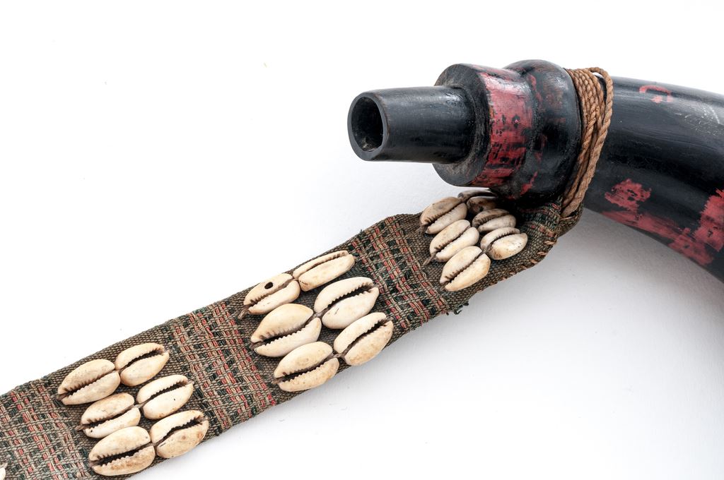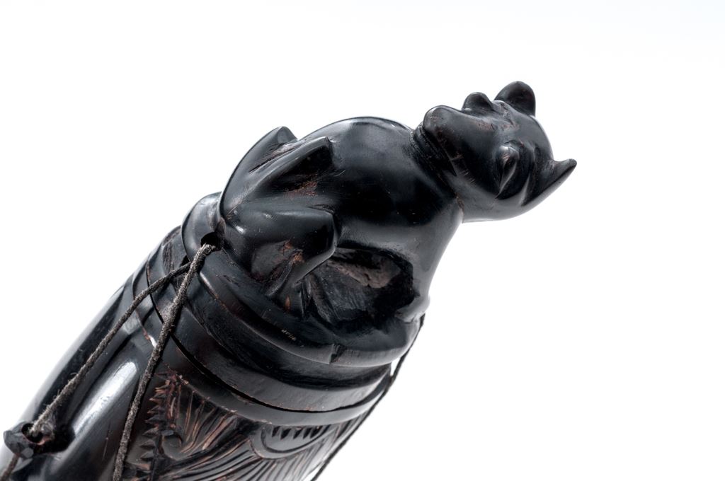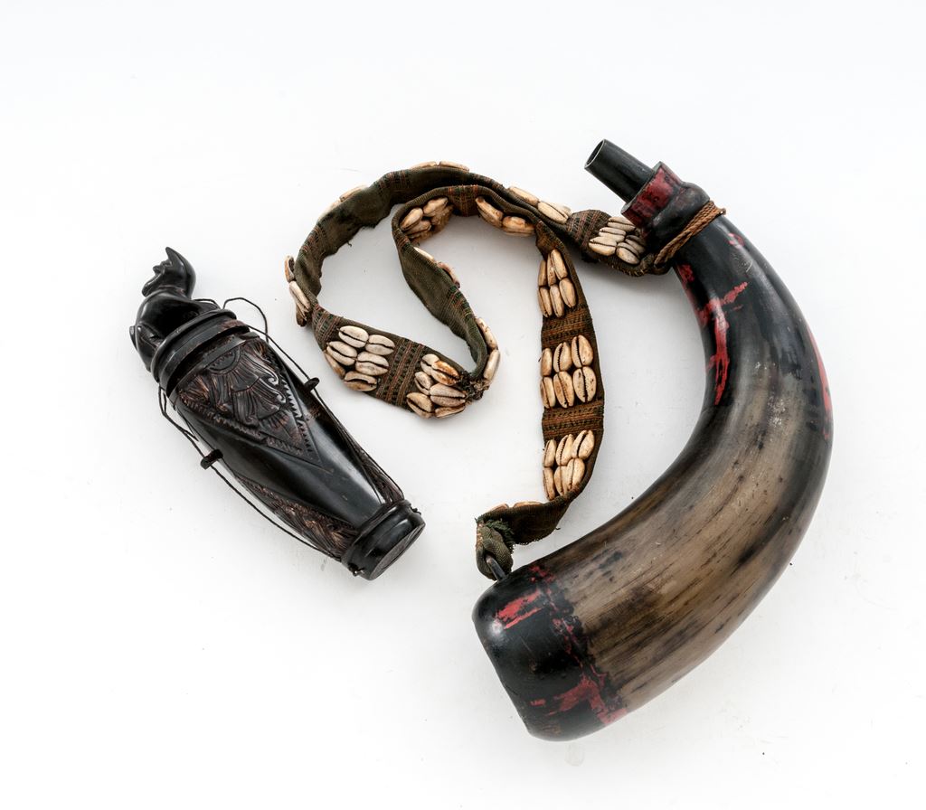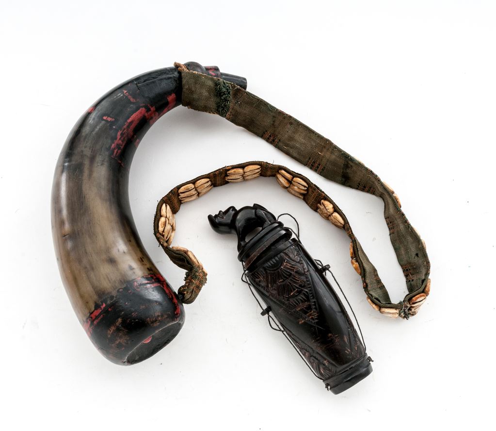 Lot of Two Items: Assam Naga Powder Horn & Carved Horn Asian Container: (1) Nice large lacquered powder horn from the Lushai Hills area of Assam, Northern India. Used by the Naga, possibly the Tobokka tribe. Painted with black and red lacquer having a very nice woven cloth strap decorated with cowry shells. Spout cover is missing, measuring about 15'' long and 3'' wide at the base. Condition is good showing wear to the painted finish, scuffs and scrapes, and an old repair near the spout. The cloth strap shows age and soiling, but is very sound, and has all the cowry shells intact. (2) Carved water buffalo horn container, with lid in the shape of an animal. The body is decorated with carved designs in bordered panels; the lid has some kind of animal looking back over its shoulders. There are holes in the body and lid, and carved loops for a string that passes through the body and lid to keep it together when worn. Possibly used for medicine or other items, similar to a Japanese inro. Measures about 7-3/4'' tall and 2-1/4'' wide. Condition is very good showing only light use and age. Est.: $250-$400/lot.