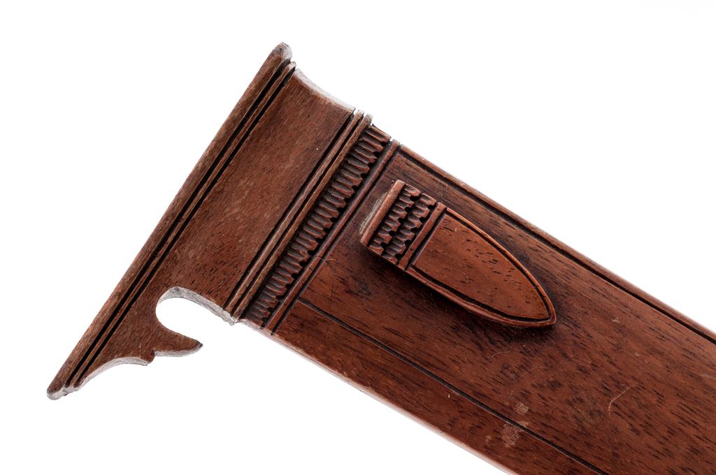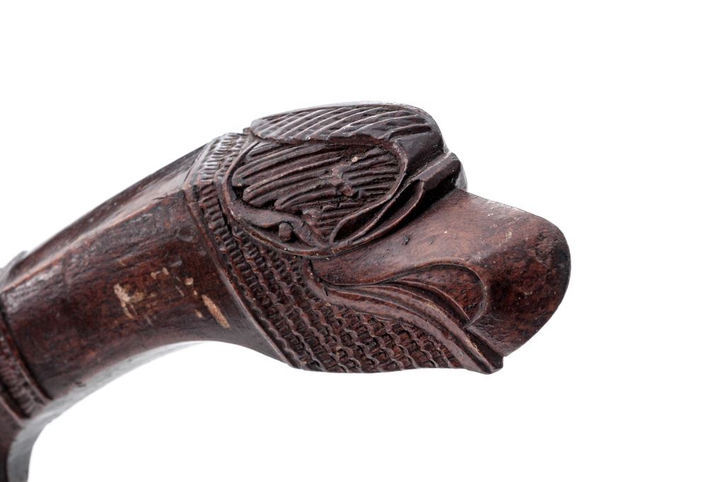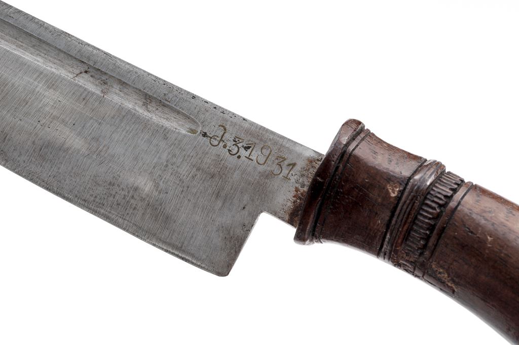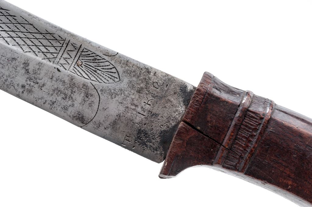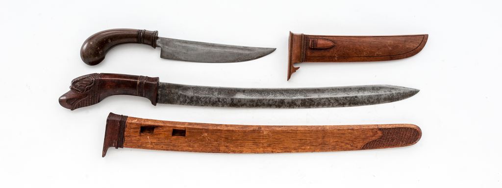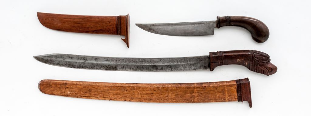 Lot of Two (2) Antique Indonesian Edged Weapons from Java: (1) Wedong knife, 7'' long wide blade with single narrow fuller. There is an etched date of 1931 near the base of the blade. Smooth wood handle has some carved details near the blade end. Wood scabbard is nicely carved near the opening for the blade and has a boss for a hanging strap. OAL is 13''. Condition is very good with a clean blade showing only light age graying. Wood grip is very nice showing only light age. Scabbard is in good condition with a few light scuffs and scratches. (2) Javanese Golok knife, 15-3/4'' blade with wide single fuller and engraved designs inside the fuller. Ricasso area has some Indonesian letters or numbers engraved. Wood handle is beautifully carved in the shape of an eagle's head. Wood scabbard has carved decorations resembling feathers at the base, and a decorated border near the blade opening. OAL is 24-1/2''. Condition is good, the blade showing age graying, light rust stains and light pitting. Wood grip has a small crack near the base and some scuffs and scratches from age and use. Scabbard has some splitting at the seam of the two halves and an old glue repair at the blade opening mouth. There are some light scuffs and dings to the body of the scabbard. Est.: $200-$300/lot.