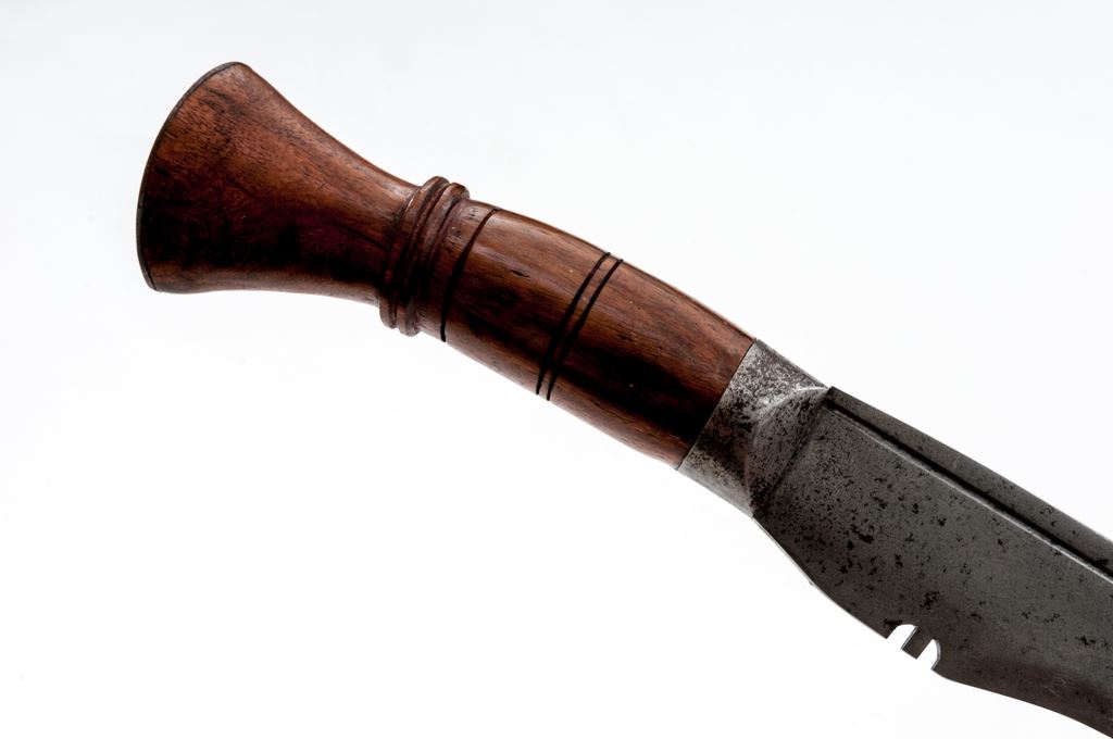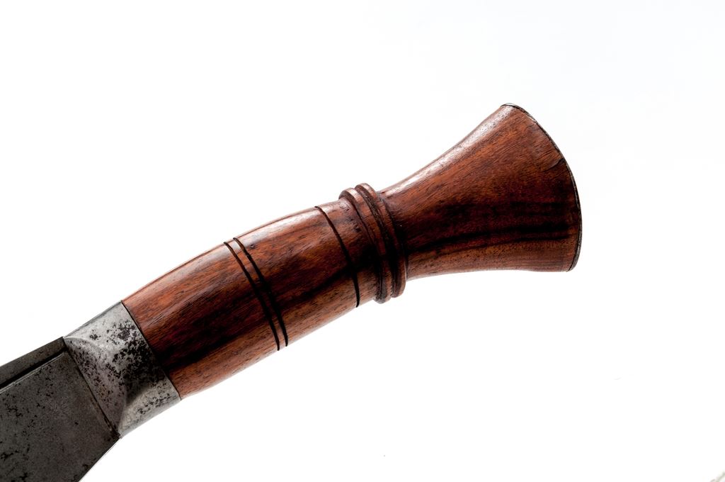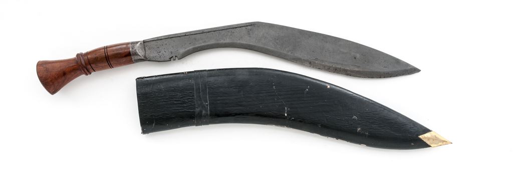 Massive Display or Ceremonial Indian Kukri Knife, approx. 23'' in length, carved and grooved wood handle with metal tip, in leather-covered scabbard with brass tip. The curved kukri blade has a thin groove on either side of top edge, and two sword breaker slots on the bottom edge of ricasso area. There is a metal reinforcing cap on the blade side of the wood handle. Handle is approx. 8'' long and decorated with grooves and a flared pommel area for a two-handed grip. Tip of handle is covered with a steel plate having a raised diamond shape in the center. Condition is very good, the blade showing age graying, scattered pinprick pitting overall, and some large edge nicks near the tip. There is some rust and light pitting on the metal reinforcing cap and pommel cap. Leather-covered wood scabbard is sound with scuffs, scrapes, and cracking to the leather. Brass tip shows some surface scratches. Est.: $100-$200.