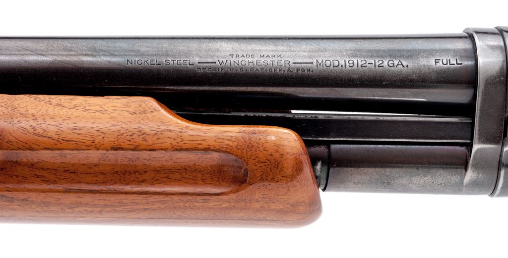 Winchester Model 12 Pump-Action Shotgun, #68705, 12 ga., 2-3/4'' chamber, choked Full, 30'' barrel, blue finish, smooth pistol-grip walnut stock, with grooved forend. Mfg'd 1914. Condition is fine as refinished, retaining approx. 85% lightly thinning blue. Stock appears to be a late refinished replacement and shows very well. Crisp action, bright bore. Est.: $250-$450. (C&R)