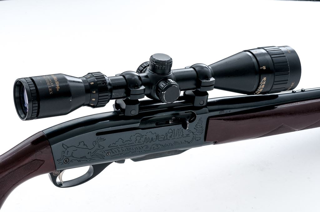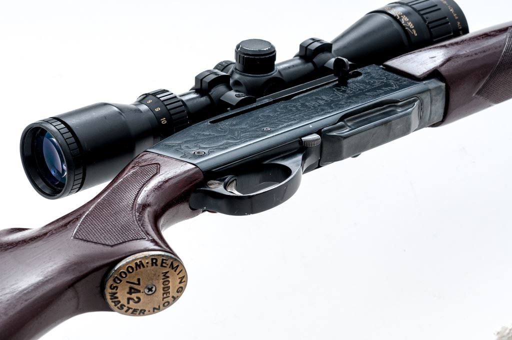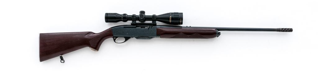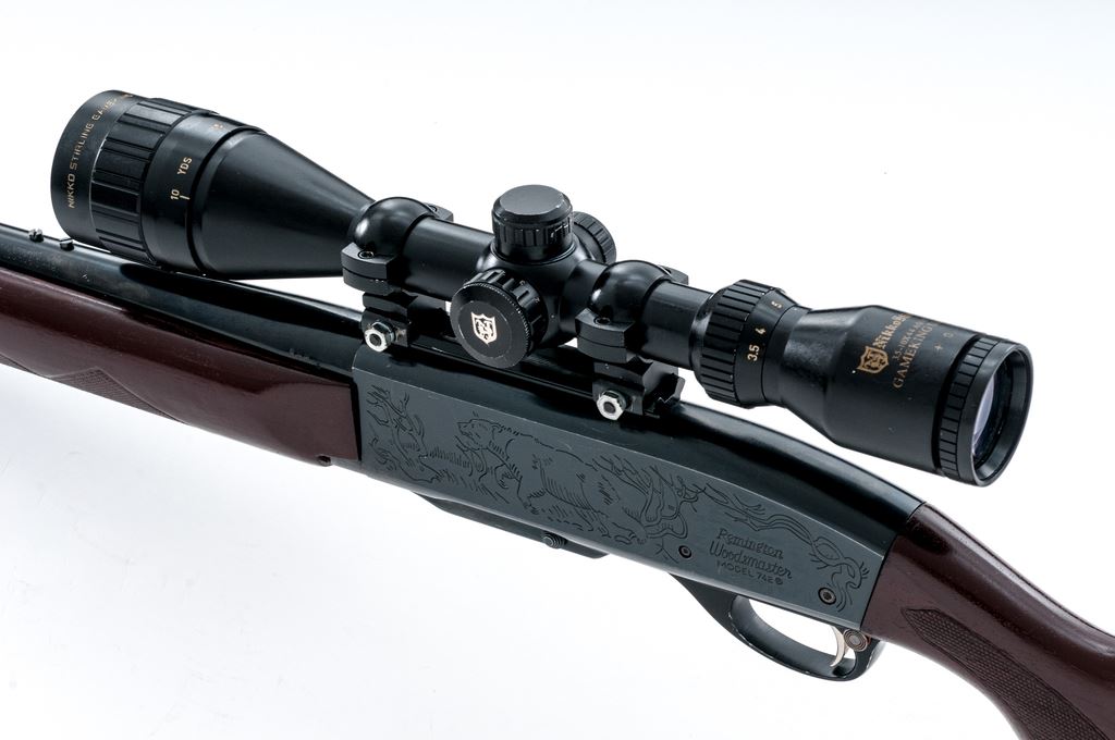 Remington Model 742ADL Deluxe Woodsmaster Semi-Automatic Rifle, #23579, .30-06 cal., 24'' barrel which includes the muzzlebrake, blue finish, receiver with roll engraved game scenes, pistol-grip hardwood stock is finely checkered at the wrist and forend with checkered aluminum Remington buttplate, ''Model 742'' grip cap, sling swivels. Includes one magazine. No sights. Topped with a Nikko Stirling Game King 3.5-10x44 side LRX scope with illuminated LRX reticle, 1'' tube, matte black finish. Barrel date code is ''RG'', mfg'd ca. 1960. Rifle is very good with approx. 95% remaining original finish; left side of receiver with light scratching. Factory lettering and roll engraving is clear and crisp. Stock with an added darker reddish brown stain over scattered shallow marks from field use. Excellent action, bright bore with nice defined rifling. Scope with some light edge wear to the adjustment knobs and a few small scratches; optics are bright and clear. Est.: $250-$400. (C&R)
