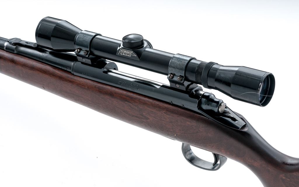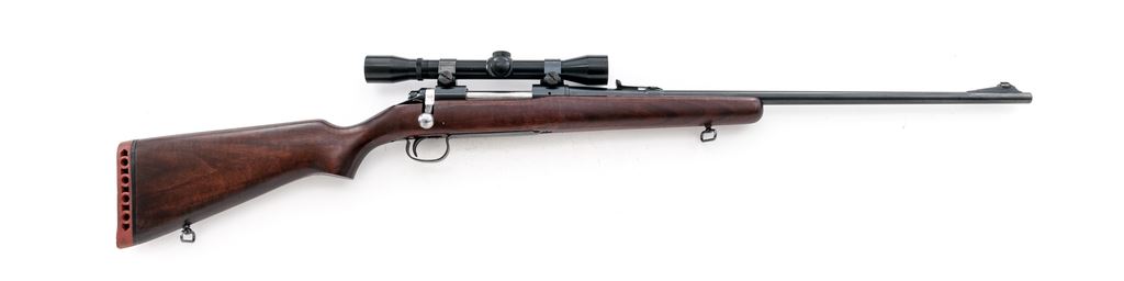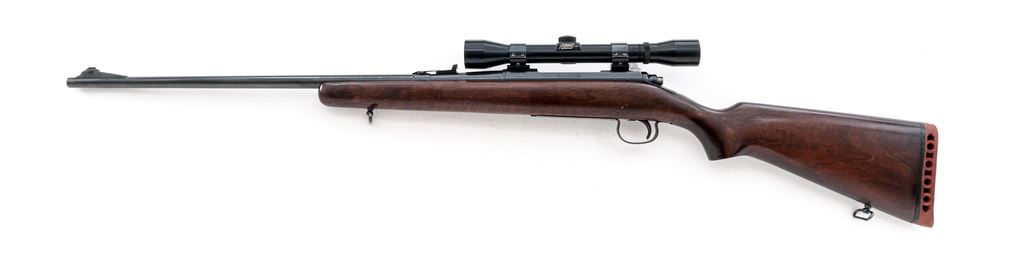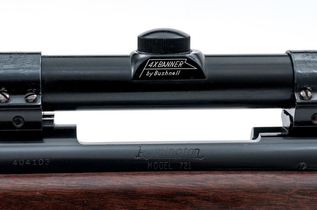 Remington Model 721 Bolt Action Rifle, #404103, .30-06 cal., 24'' barrel, blue finish, smooth pistol-grip walnut stock, with period correct Redhead rubber butt pad. Topped with a Bushnell 4x Banner scope on Weaver rings and mounts. Original iron sights are retained. Condition is excellent retaining approx. 96%+ blue to metal surfaces. Stock is excellent with only the lightest markings. Good action, mirror bright bore, scope optics with simple crosshair are excellent. Est.: $350-$500. (C&R)
