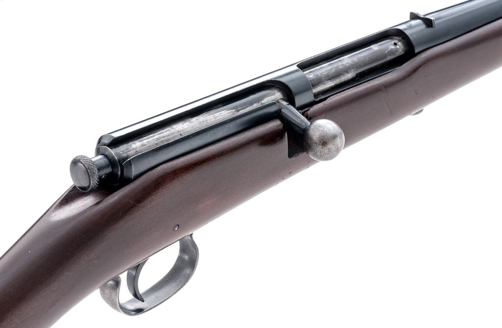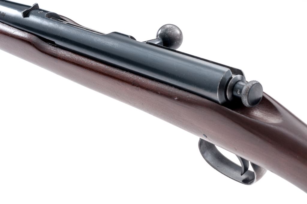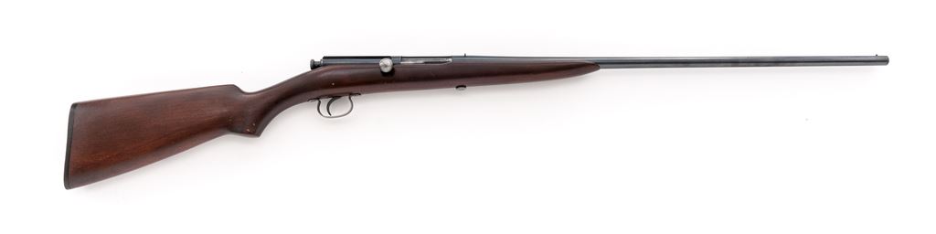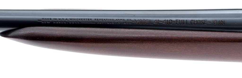 Winchester Model 41 Single Shot Shotgun, NVSN, .410 bore, 24'' barrel choked Full, 3'' chamber, blue finish, dark stained gumwood stock, with factory checkered hard rubber buttplate. Mfg'd predominantly from 1920 to 1934, and then sold intermittently until 1941. Condition is excellent retaining approx. 98% factory blue to frame and barrel tube. Bolt retains 60% original blue with losses in actioning areas. Stock with light general impressions near right side pistol-grip area and along bottom edge of buttstock. Action needs a little work as cocking knob does not stay back; bore is mirror bright. Est.: $450-$650. (C&R)