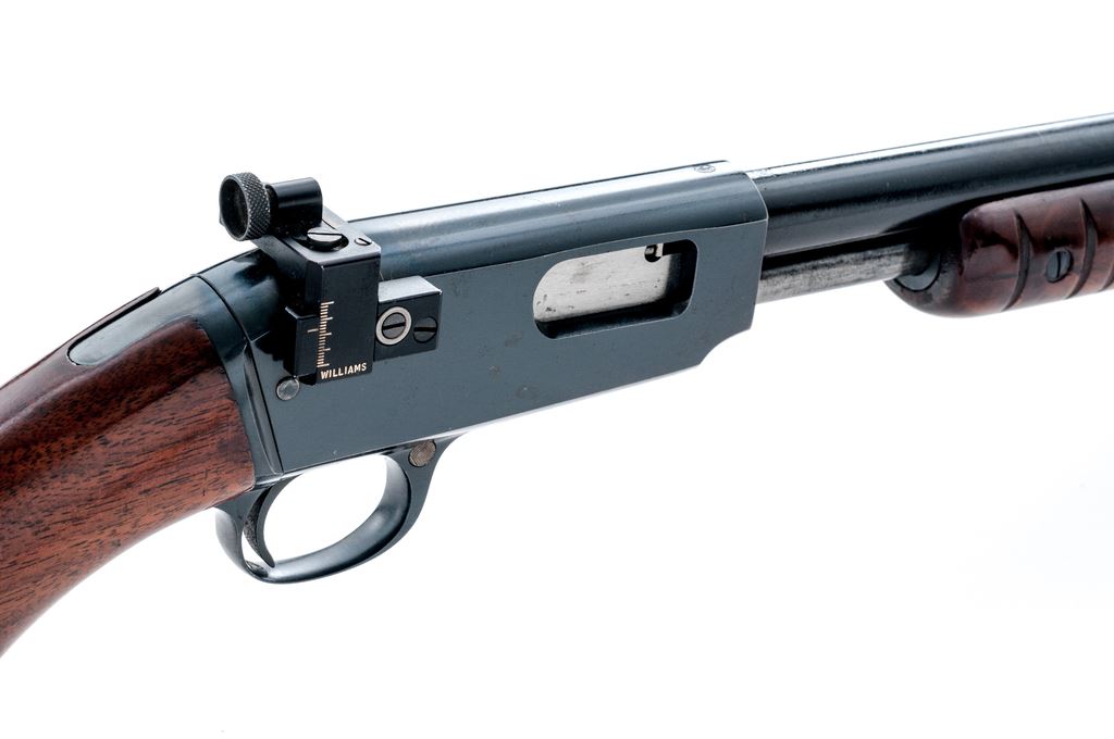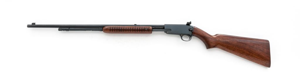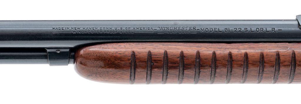 Winchester Model 61 Slide-Action Rifle, #109176, .22 S-L-LR cal., 24'' barrel, blue finish, walnut stock and 17-groove forend, with gold bead front and Williams receiver sight, with dovetailed blank in original rear sight position. Mfg'd 1949. Condition is near excellent retaining approx. 94% original factory blue, with most of the losses in actioning area with light general thinning, and only the lightest impressions to stock. Good action, bright bore. Est.: $500-$750. (C&R)