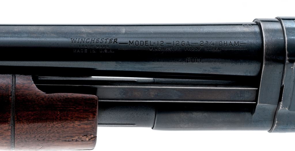 Late 50's Winchester Model 12 Slide-Action Shotgun, #1629261, 12 ga., 28'' plain barrel with silver bead front sight, 2-3/4'' chamber, choked Full. Pistol-grip walnut stock and larger 14-groove forend with a vented brown rubber Pachmayr recoil pad; LOP over rubber pad is 13-7/8'', end of wood is 13''. Top of barrel and receiver are both Winchester proofed. Mfg'd 1957. Condition is very good retaining approx. 90% original blue with most of the losses to the mag tube and highpoints of the frame. Factory lettering is clear and defined. Wood shows signs of moderate field wear including scattered shallow scratches and handling marks, most of the finish remains; left rear edge of forend with an approx. 1''x1'' chip that was re-attached and remains solid. Action is crisp and functions properly; bore is mirror bright with one tiny ding approx. 3-1/2'' down from the muzzle. Est.: $300-$400. (C&R)