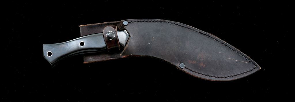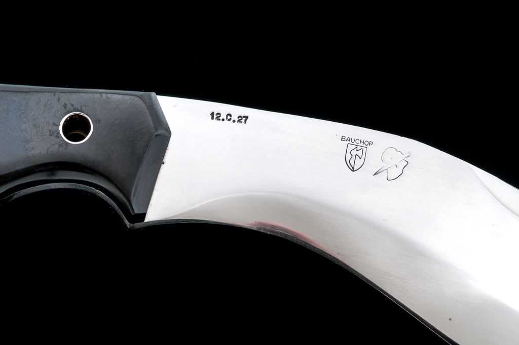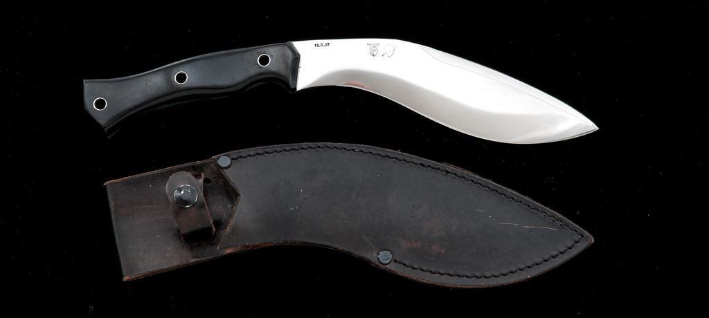 Custom Kukri Fighter, by South African Knife Maker Peter Bauchop, with sheath, 8'' mirror polished blade, 13.5'' overall. Full tang construction with black micarta scales. Blade is marked with Bauchop logo and ''12.C.27'' on one side and ''87.20''. In black leather sheath. Blade is excellent with general micro-scratching; cutting edge is clean, sharp, and retains the original edge. Scales with small handling marks and several small nicks around the upper ferrule. Maker's marks are clear. Sheath is very good showing moderate surface wear; no fraying, etc. at the stitching or seams. Est.: $250-$350.
