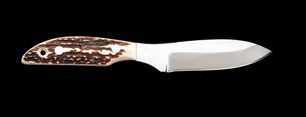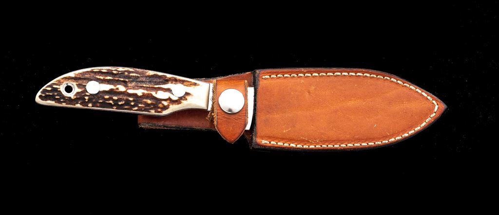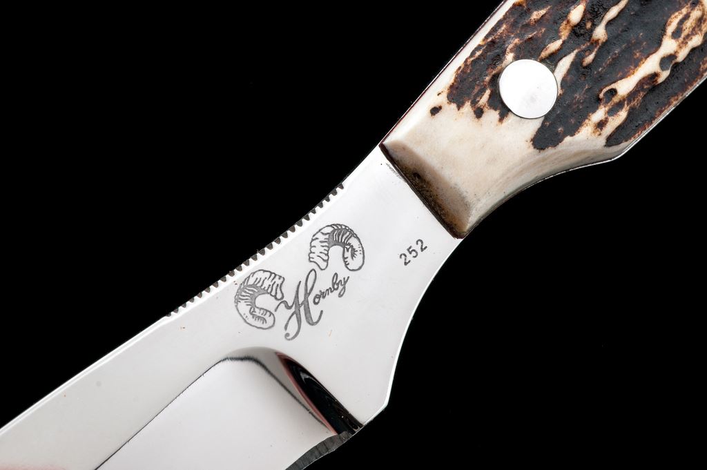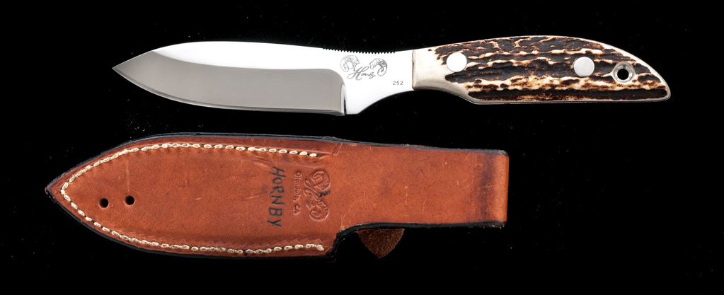 Custom Fixed Blade Knife, by Glenn Hornby (Glendale, CA), with sheath, 4.75'' mirror polished drop-point blade, 9''overall, full tang, stag scales with stainless hardware and thin red spacers. 1'' of top of blade is notched for thumb traction. Blade with ''Hornby'' Logo and ''252'' marked on ricasso. In brown leather sheath that is stamped ''Hornby'' on the backside. Knife is near excellent with a nice mirror polished finish, some light surface scratching, cutting edge is clean and sharp. Scales are excellent. Sheath is very good with surface scuffs and scratches; no fraying, etc. at the stitching or seams. Est.: $150-$250.