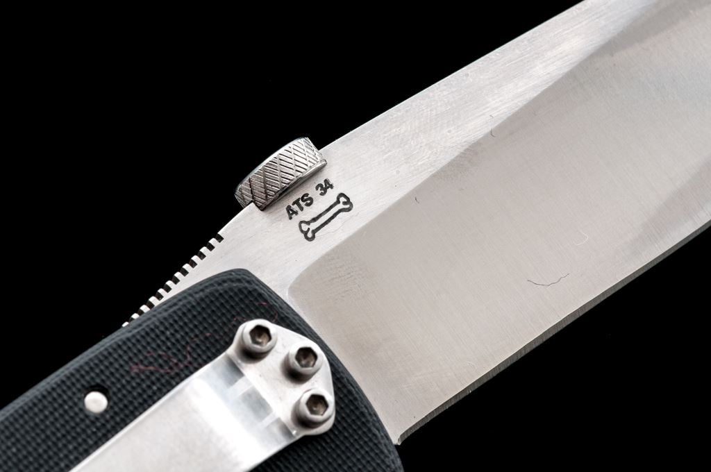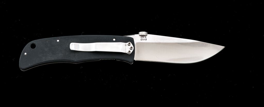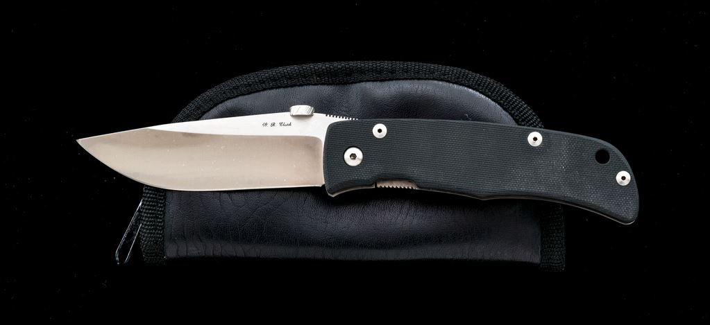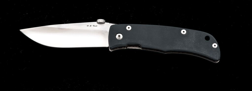 W.R. Clark Custom Linerlock Folding Knife, 3.75'' satin finished ATS-34 drop point blade, ambidextrous thumb stud, black G-10 handles, with carry clip. Top of the blade behind the thumb stud is notched for thumb traction. Left side of the blade is marked ''W.R. Clark''; right side with ''Bone'' logo. In excellent as new condition, never carried or sharpened. Knife comes in a small padded case. Est.: $150-$250.