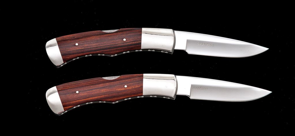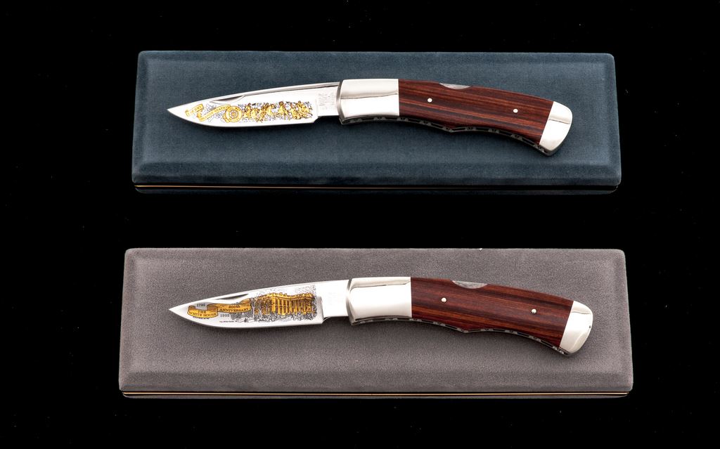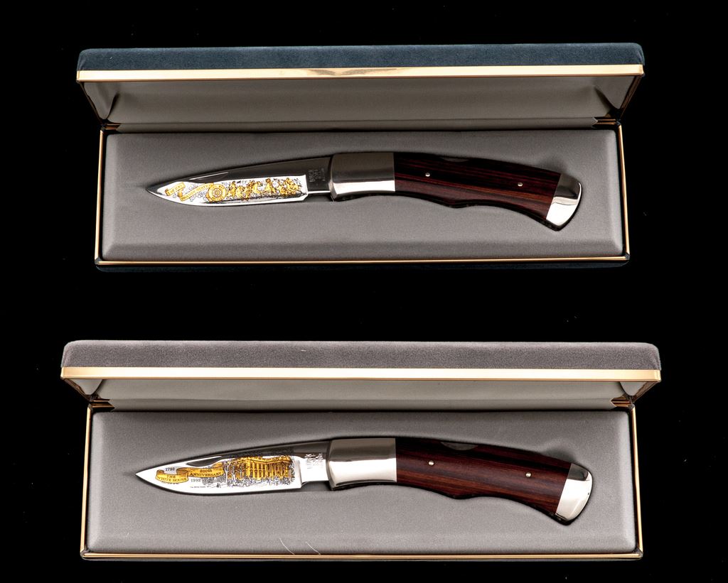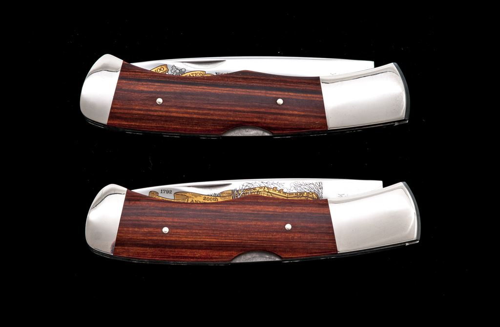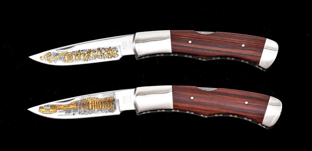 Lot of Two (2) Limited Edition Etched Blade Buck Model 531 Folding Knives: 1.) 1 of only 100 commemorating the Battle of Brandy Station, etched blade with gold highlighted Civil War scene and reads ''1 of 100 Brandy Station''. Backside of blade is numbered ''049/100''. Wood handles with nickel silver pins and bolsters. Included is a gray velvet clamshell case, COA, misc. factory paperwork, and plain cardboard sleeve. Mfg'd in 1991. Bolsters with light scuffs and scratches. Blade, handles, case, etc. are excellent; never carried or sharpened. 2.) 1 of only 500 commemorating the 200th Anniversary of the White House, etched blade with gold highlighted White House scene. Backside of blade is numbered ''011/500''. Wood handles with nickel silver pins and bolsters. Included is a gray velvet clamshell case, COA, misc. factory paperwork, and plain cardboard sleeve. Mfg'd in 1991. Overall condition is excellent, never carried or sharpened. Bolsters with light micro-scratching. Blade, handles, case, etc. are as new. Est.: $200-$250/lot.