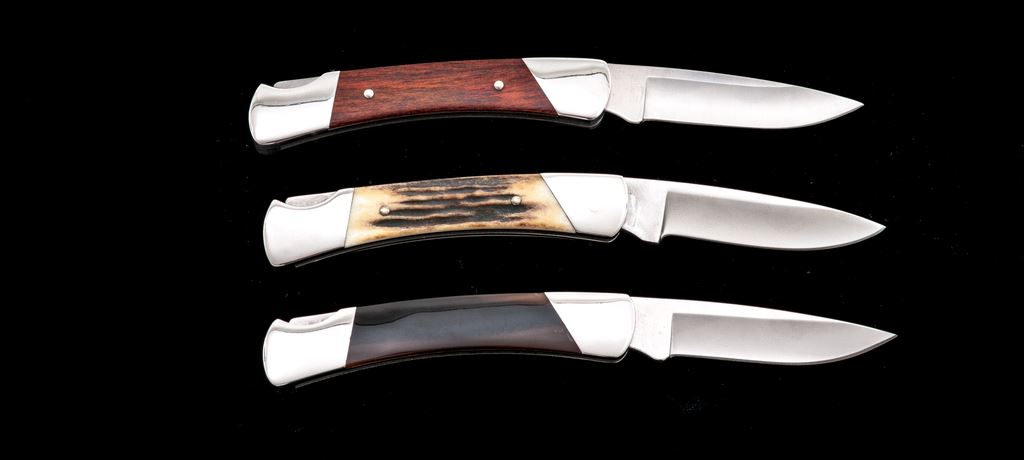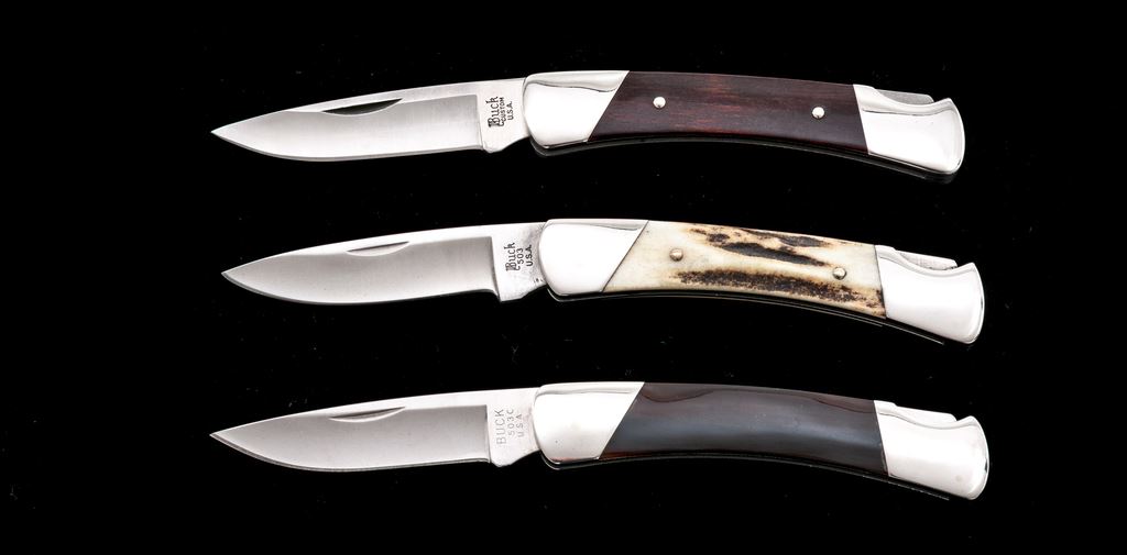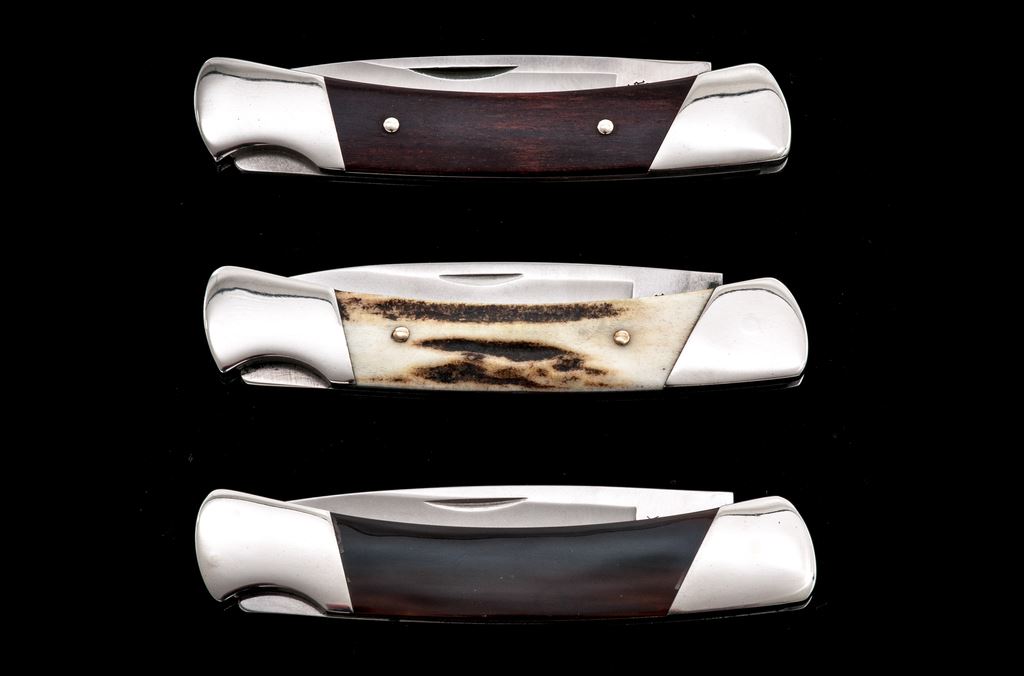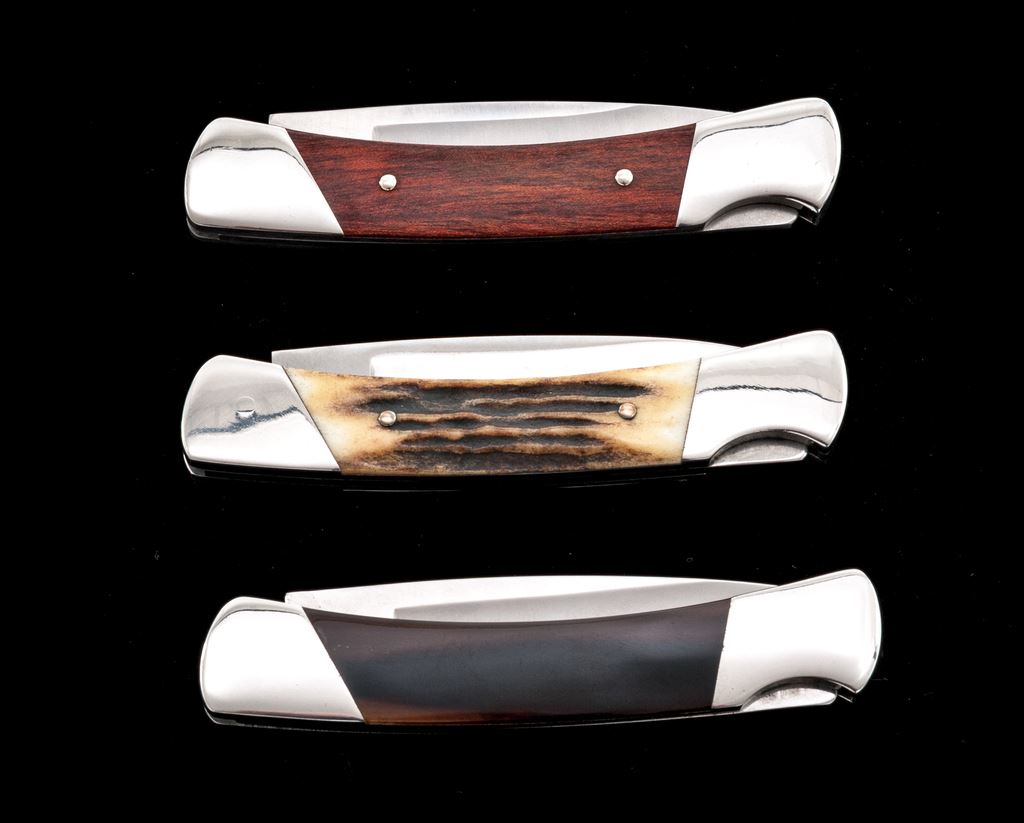 Lot of Three (3) Buck Model 503 ''Prince'' Folding Knives, including exotic handles: 1.) Water buffalo handles with mirror polished bolsters. Mfg'd in 1995. 2.) Buck Custom with rosewood handles, Buck ''Custom'' script logo, mirror polished bolsters. 3.) Sambar stag handles, Buck ''Script'' logo, and mirror polished bolsters. Knives with 2-3/8 blades and 3-3/8'' overall closed lengths. All knives are in excellent condition, never carried or sharpened. Bolsters with a small amount of slight handling marks. Est.: $150-$250/lot