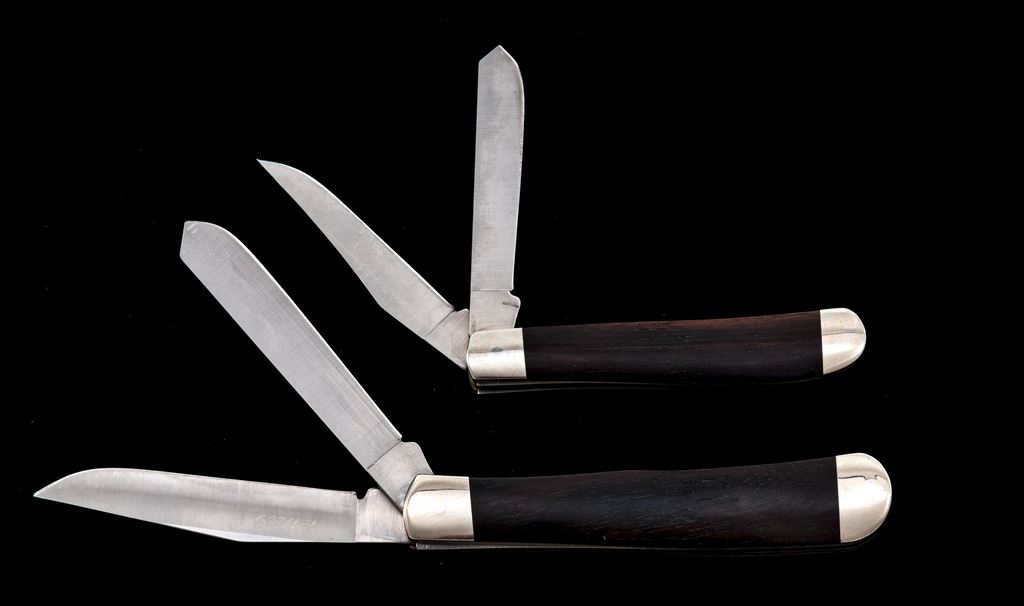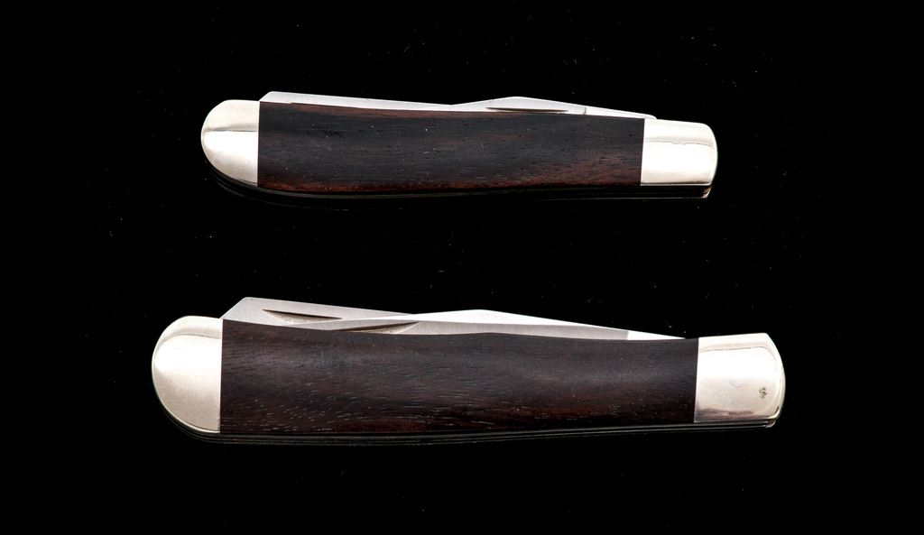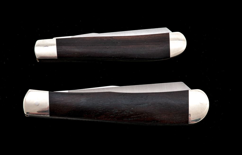 Numbered Pair of Buck Model 312 and 314 Trapper Pattern Folding Knives, both with Macassar ebony handles. Overall closed length of the 312 is 3.5''; 314 is 4.25''. With three-line blades stamps, both are numbered 187/250 on the backside. The model 312 was made in 1993; model 314 in 1990. In a white cardboard ''Trapper Set'' box, catalog #2214; box is numbered to the knives. With the COA and other misc. factory paperwork. Only 250 of these sets were produced for Jack Jenkins Knives and Jewelry. Both knives are in excellent condition, never carried or sharpened. Est.: $150-$250/lot.