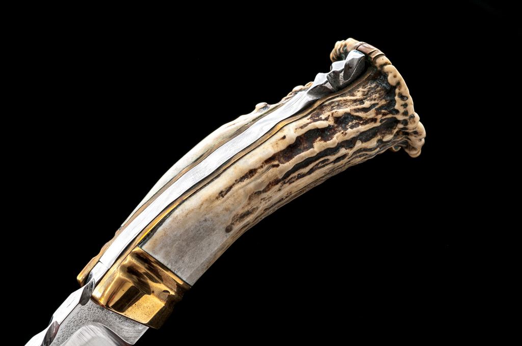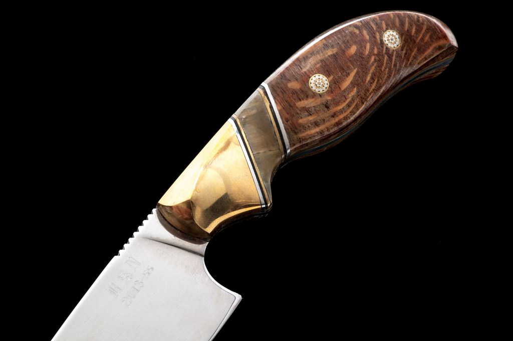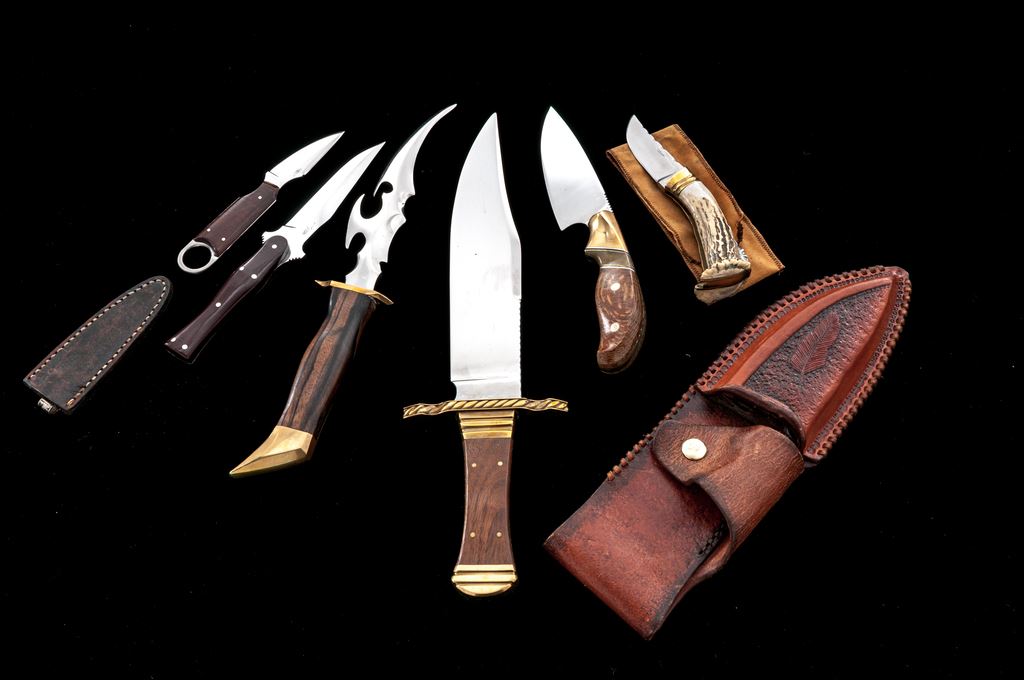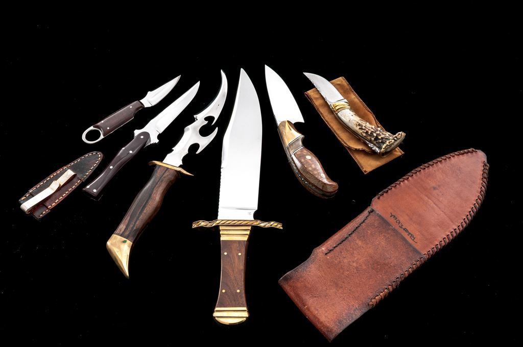 Lot of Six (6) Custom Knives by Unidentified Makers: 1.) Caping knife, 2.75'' spear point blade, blade is signed but not legible, 6.5'' overall, full tang with hardwood scales. Included is an unmarked leather sheath. Knife condition is very good, showing signs of light handling and use. Sheath is good. 2.) Bowie knife, 10'' blade is marked with a simple ''K'', 15'' overall, walnut scales; brass guard, pins and bolsters. Top edge of blade is partially file worked. Knife is in fine overall condition. Blade with a little micro-scratching. Brass pieces show mild toning. Overall a solid knife. 3.) 7.25'' fantasy type blade, signed but not legible, 13.25'' overall, one-piece hardwood handle, brass guard and pommel. Condition is good. Metal with scattered light to moderate scratching. 4.) 4.5'' mirror polished blade, maker's mark is not legible, 9'' overall, maroon micarta scales, tang is notched for finger placement. A nicely made knife in fine overall condition. Blade with some scattered micro-scratching that appears to be from storage as both of the sharpened edges appear unused. Micrata scales with small handling marks. 5.) Lockback folding knife, 3'' blade, partially file worked spine, brass bolsters, crown stag handle. Knife is in good lightly used condition. Brass with a few very small spots of surface rust. Stag handle is solid and locking mechanism functions properly. 6.) 4.75'' drop-point blade, marked ''R.S.N'' and ''2013-SS'', 9.5'' overall, full tang, finger grooved brass bolsters; with some file work and mosaic pins on the spine. Hardwood scales with mosaic pins as well as brass and stainless spacers with a thicker horn spacer. In brown leather sheath with tooled leaf design on the front and boot lace type stitching. Condition overall is very good. Knife does not appear to have been used but does have some light scratching on the blade and bolsters. Sheath is also very good. Est.: $300-$500/lot.