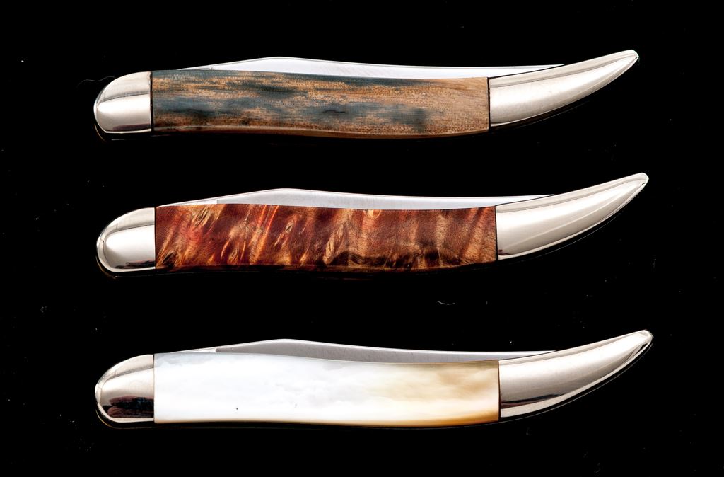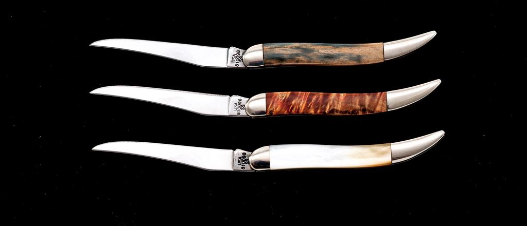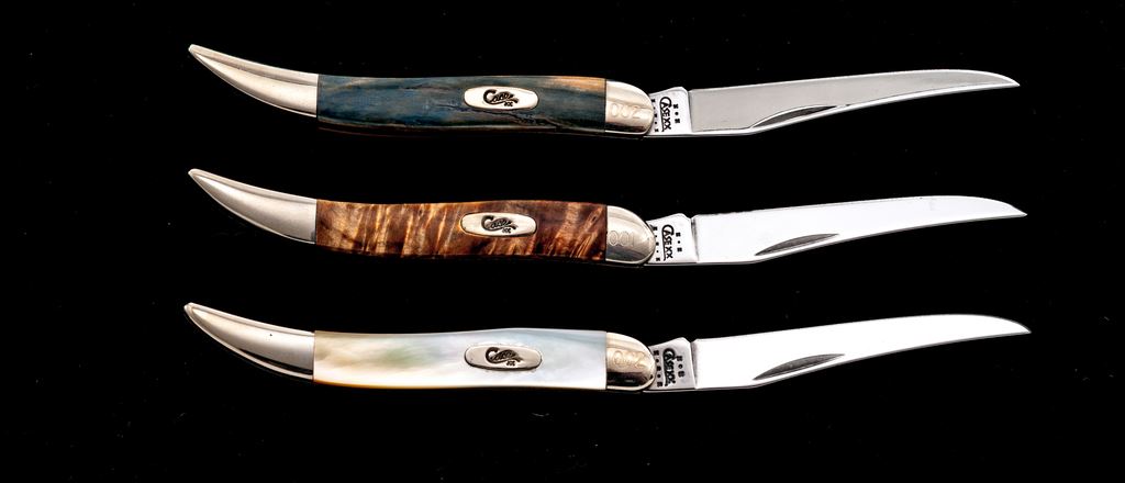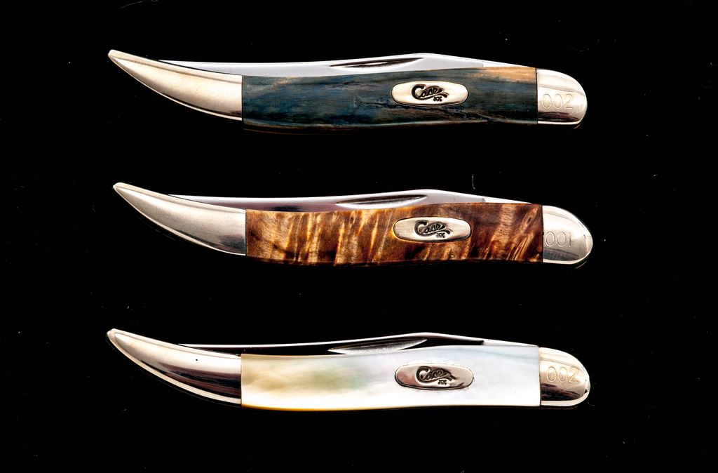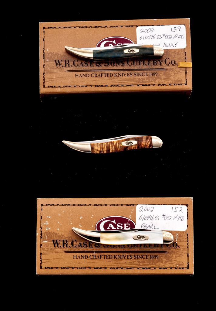 Lot of Three (3) Case Small ''Texas Toothpick'' Pattern Folding Knives, with Exotic Handles: 1.) #610096 SS, with box elder handles, bolster is numbered ''001''. Mfg'd 2002. 2.) #610096 SS, with mammoth ivory handles, bolster is numbered ''002''. Mfg'd 2002. 3.) #610096 SS, with gold mother of pearl handles, bolster is numbered ''002''. Mfg'd 2002. Each knife comes in an original black velvet Case box. All of the knives are in excellent as new condition, never carried or sharpened; bolsters with a few slight handling marks. Est.: $200-$350/lot.