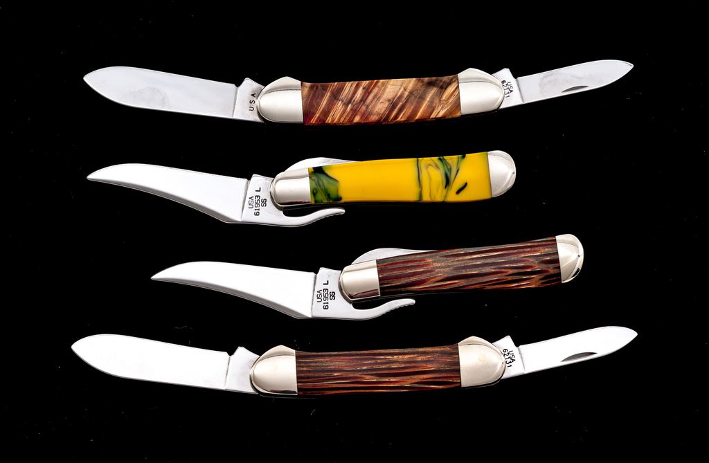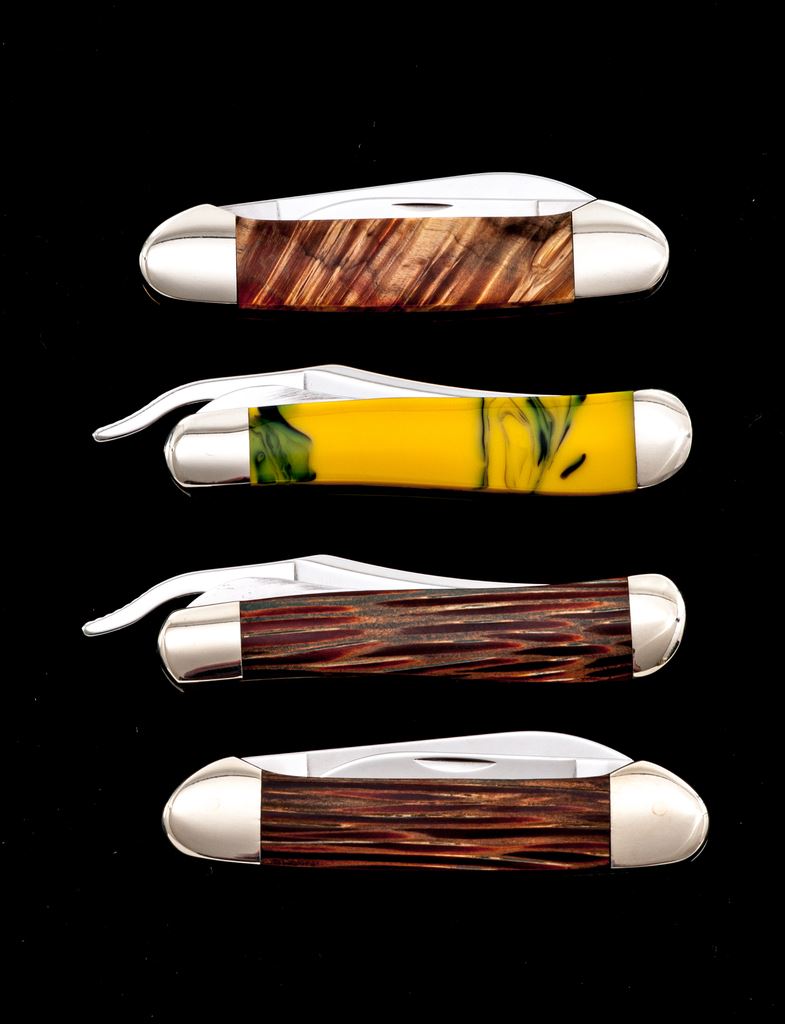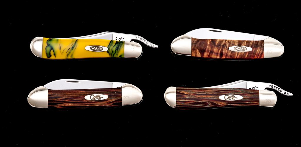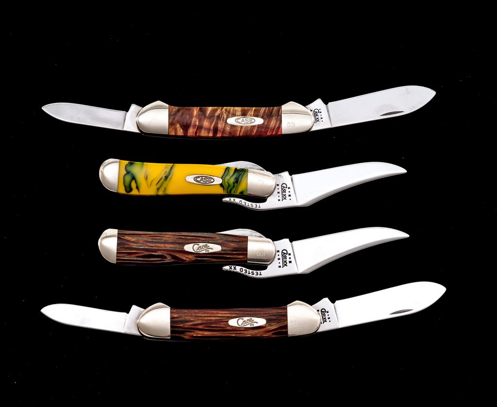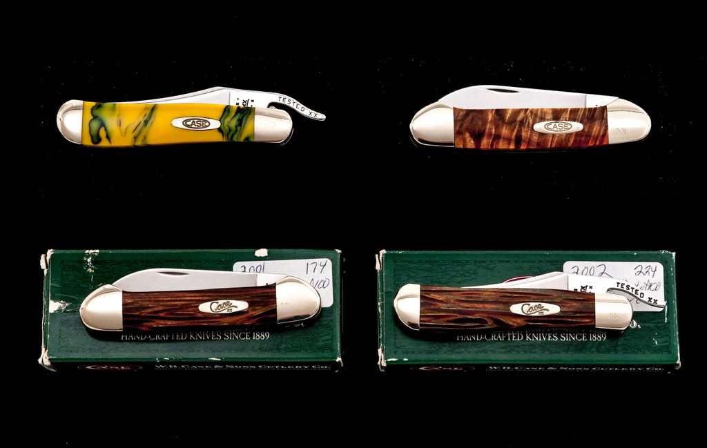 Lot of Four (4) Case ''Canoe'' and ''Russlock'' Pattern Folding Knives, with Exotic Handles: 1.) #62131 SS, Canoe pattern with Royal Palm wood handles, bolster is numbered ''001''. Mfg'd 2001. 2.) #62131 SS, Canoe pattern with box elder handles, bolster is numbered ''001''. Mfg'd 2000. 3.) #61953 L SS, Russlock pattern with Royal Palm wood handles, bolster is numbered ''001''. Mfg'd 2002. 4.) #61953 L SS, Russlock pattern with yellow and green swirled synthetic handles. Mfg'd 2002. Two (2) of the knives come in an original black velvet Case box; two (2) are in cardboard boxes. All of the knives are in excellent as new condition, never carried or sharpened, no chips or cracks to the handles; bolsters with a few slight handling marks. Est.: $250-$400/lot.