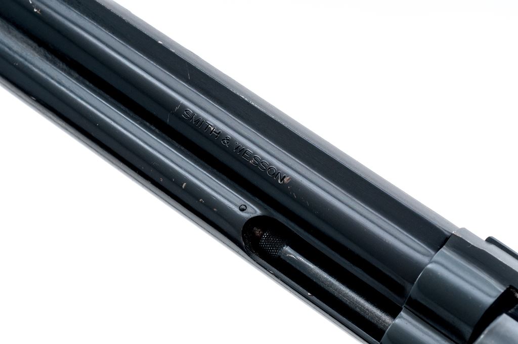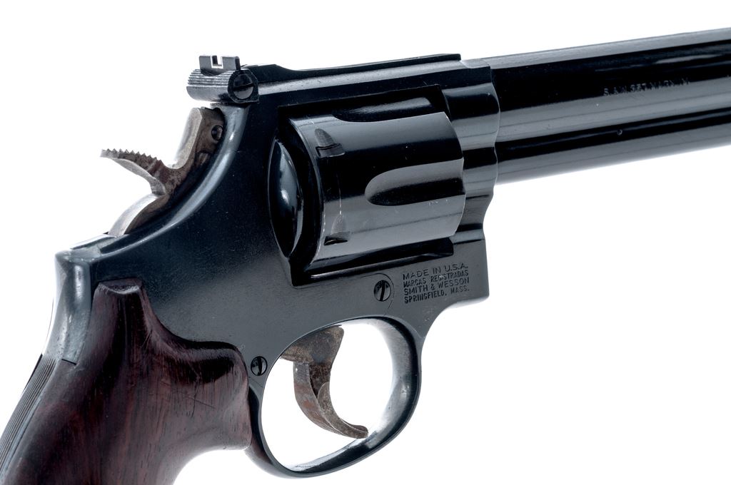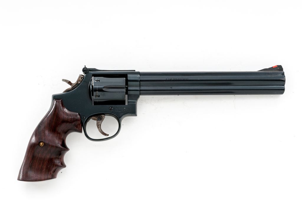 Smith & Wesson Model 586-3 Distinguished Combat Magnum Double Action Revolver, #BE09247, .357 mag. cal., 8-3/8'' barrel, dark blue finish, finger grooved hardwood Eagle grips, color case hardened semi-target hammer and target trigger, red ramp front sight and notched white outline fully adjustable rear sight. Condition overall is very good retaining approx. 95% original blue finish; 97% case colors. Metal with small surface nicks and scratches; cylinder with a light index line; factory lettering is clear and defined. Grips with intermittent shallow handling marks. Smooth, crisp action; bright bore with excellent rifling. Est.: $400-$600. (Modern/PPT)