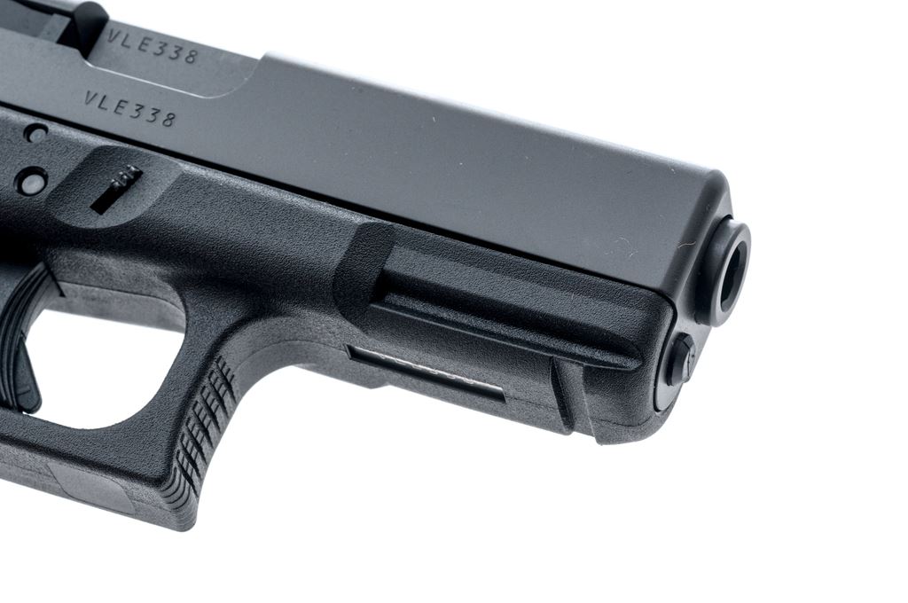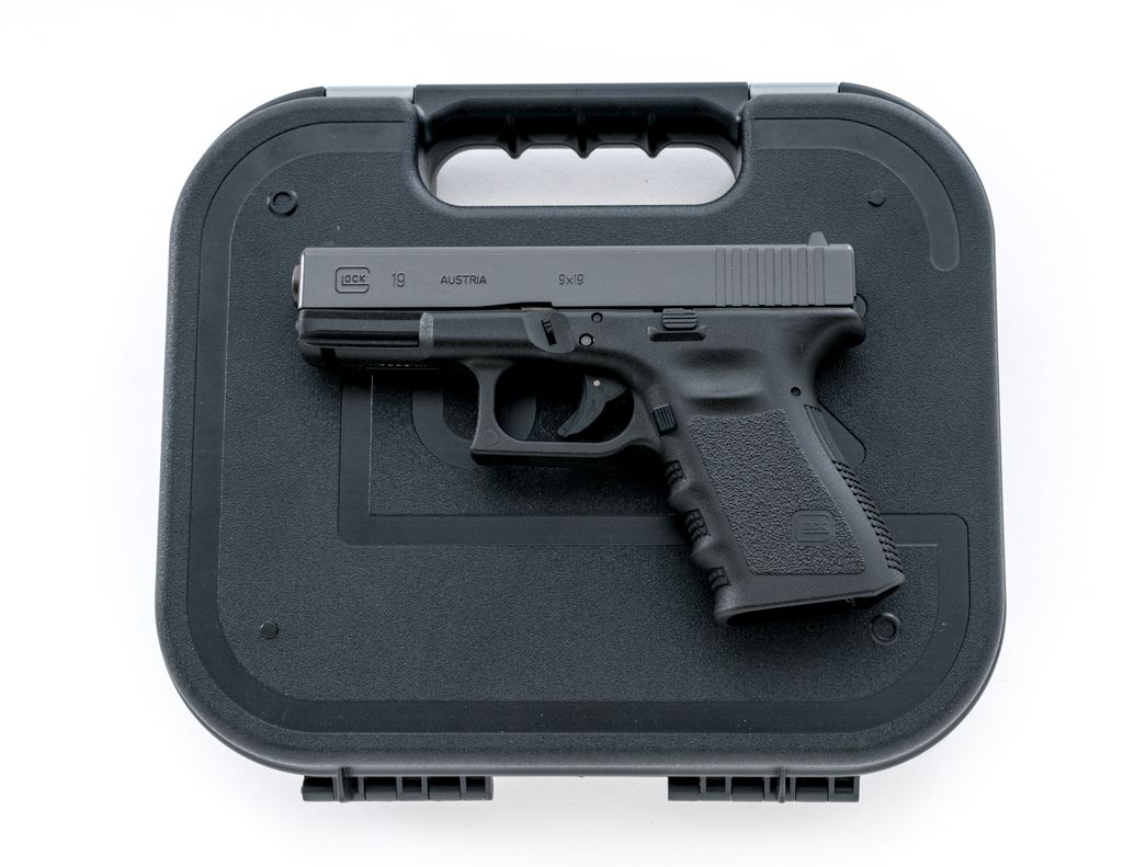 Near New Glock Model 19 Gen 3 Semi-Automatic Pistol, #VLE338, 9mm, 4.01'' barrel, black slide, black polymer frame, white-dot front sight and white outline rear sight, no magazine. In black hard shell Glock case with cable lock, cleaning accessories, speed loader, owner's manual, and other misc. paperwork. Overall this pistol appears in near new condition, inside and out very clean. Bore is mirror bright, appearing to have been fired very little. Est.: $300-$450. (Modern/PPT)