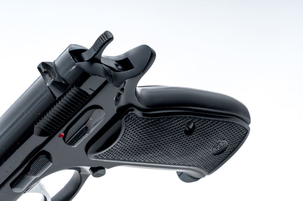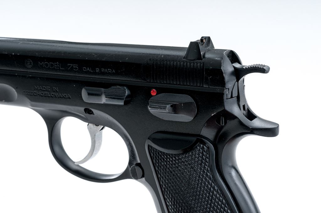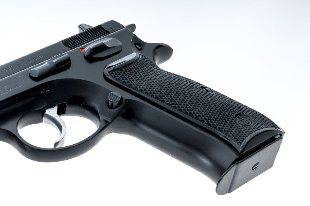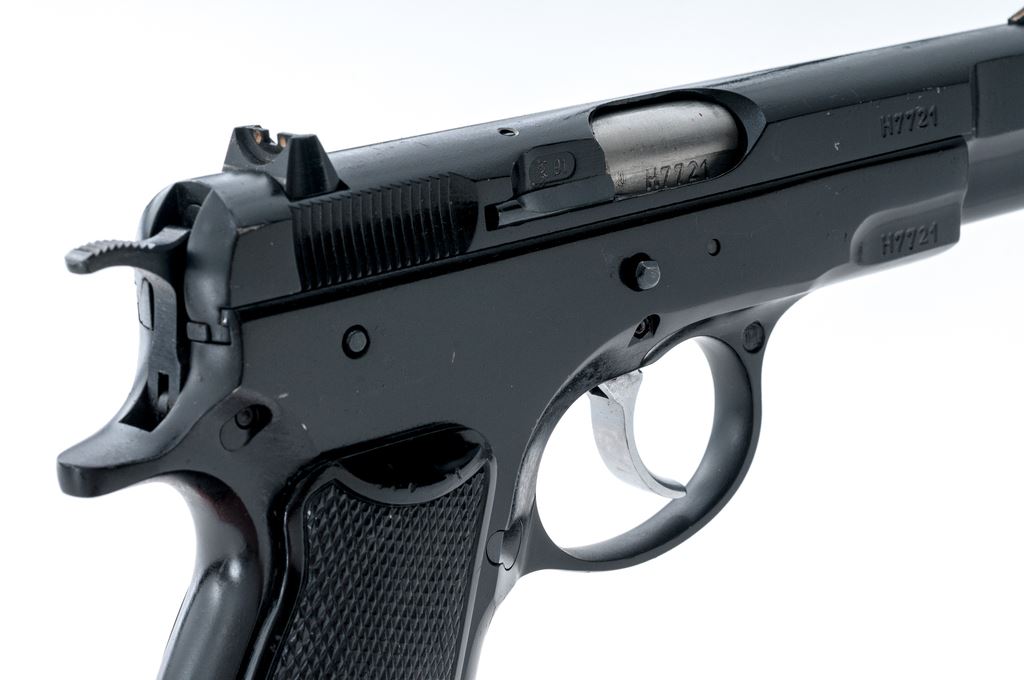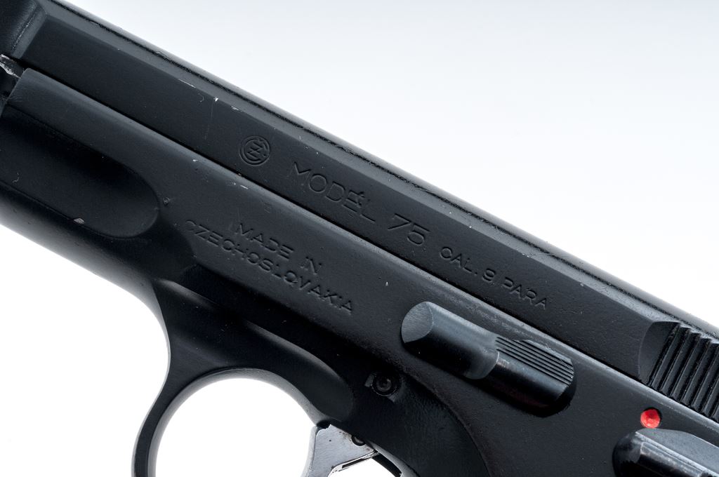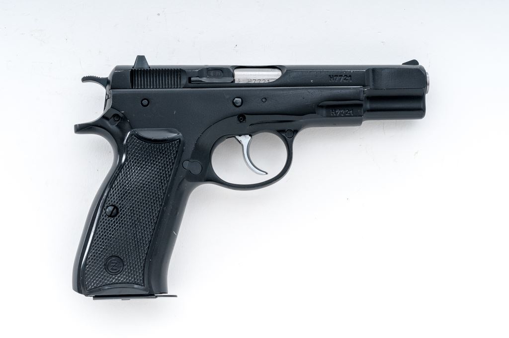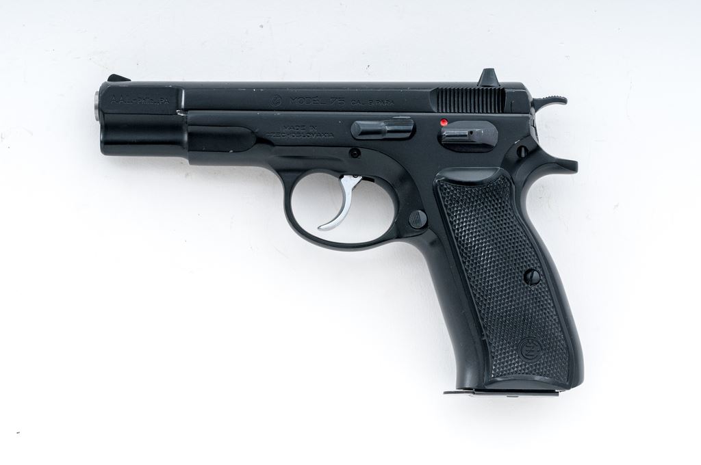 CZ Model 75 Semi-Automatic Pistol, #H7721, double/single action, 9mm cal., 4.5'' barrel, black finish, checkered black plastic CZ grips, ramped front sight and white two-dot rear sight, with one unmarked 15-round magazine. Made in Czechoslovakia. Pistol is in very good overall condition retaining approx. 93% original black finish; metal with general small surface nicks and scratches. Grips show moderate handling wear, no chips or cracks. Smooth action, mirror bright bore with excellent rifling. Est.: $300-$500. (Modern/PPT)(High-cap mags not available to Calif. residents.)