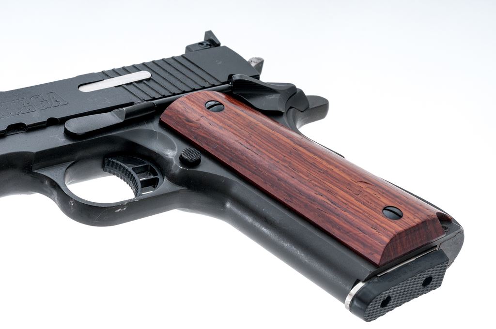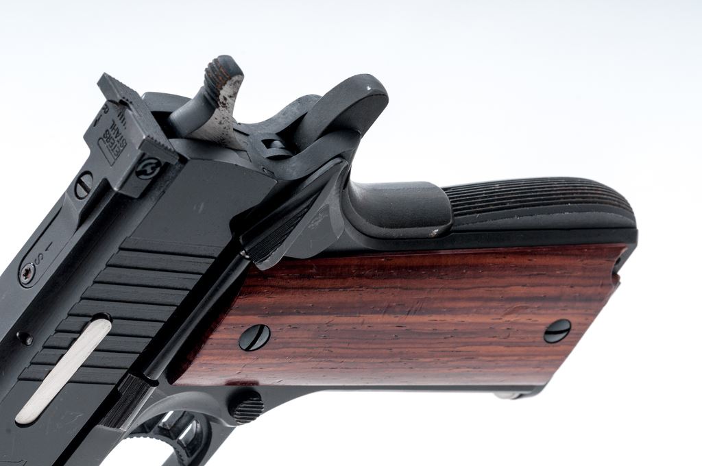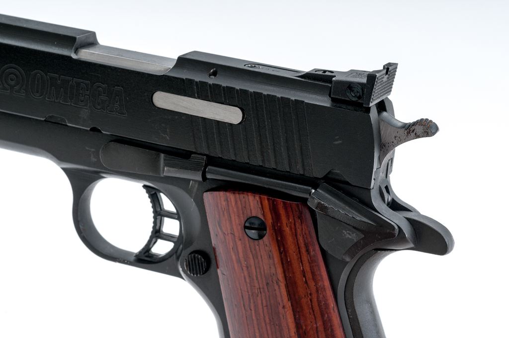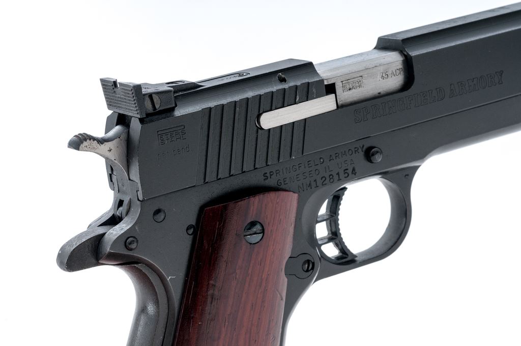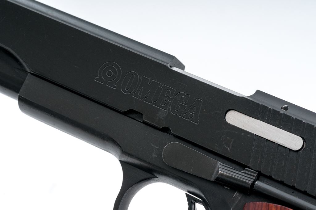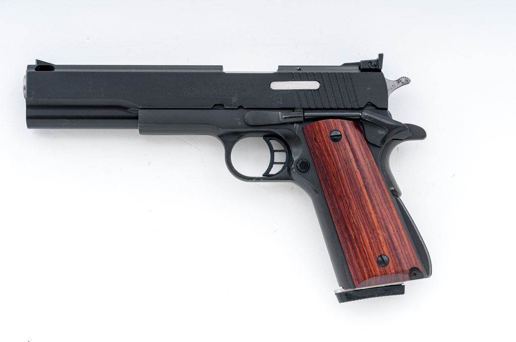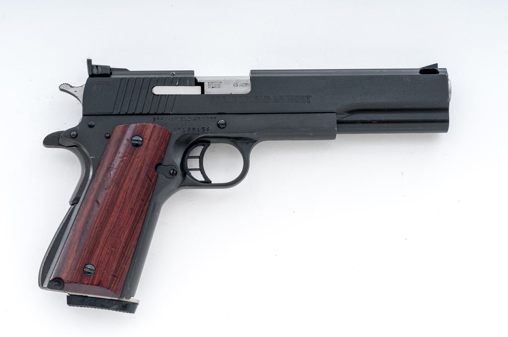 Springfield Armory Omega Semi-Automatic Pistol, #NM128154, .45 ACP cal., 6'' barrel, matte blue finish, ported slide, smooth wood grips, ramped blade front sight, fully adjustable rear sight, skeletonized trigger, one Pachmayr magazine with rubber base pad. Designed by Peters Stahl and marked with his name on rear of slide, barrel, and rear sight. Metal surfaces rate near excellent, showing just light handling marks; hammer with some tiny dark spots and pinprick pitting. Grips are good+ with several mostly moderate handling marks. Smooth action, polygonal rifled barrel is mirror bright. Est.: $600-$900. (Modern/PPT)