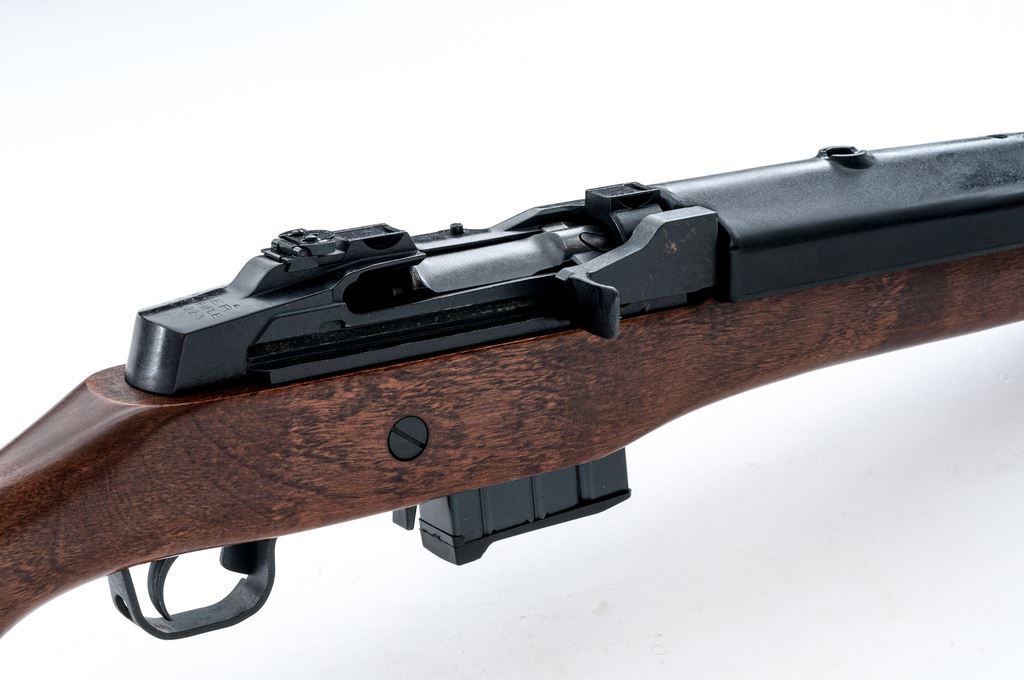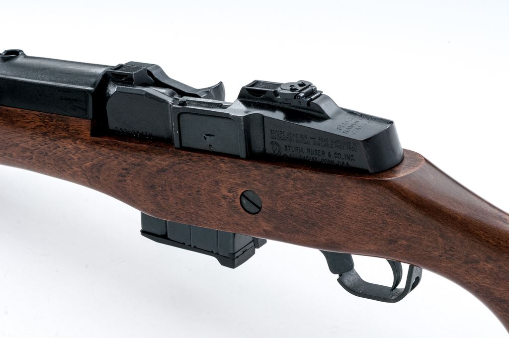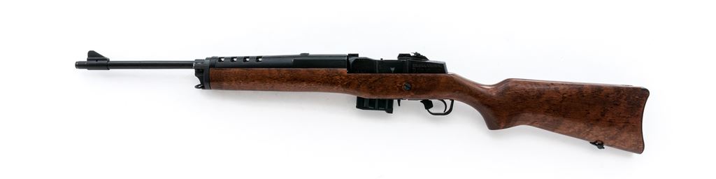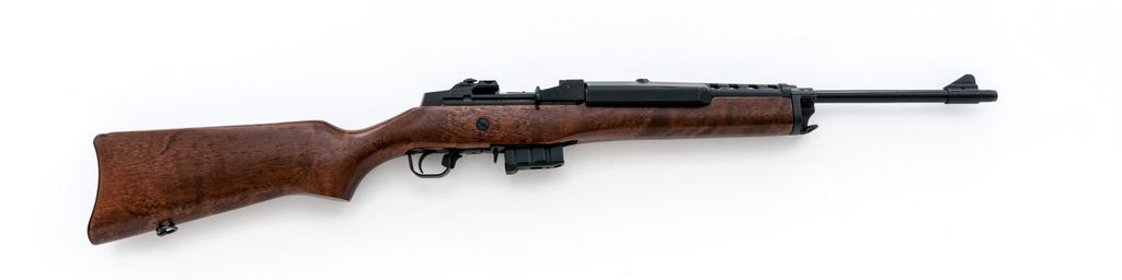 Ruger Mini-14 Ranch Rifle, #195-89710, .223 cal., 18.5'' barrel, satin blue finish, pistol-grip birch stock, factory buttplate, black upper handguard, fixed front sight, and folding rear sight, with sling swivels, and one 10-round magazine. Condition is excellent, showing only a few very minor handling marks. Smooth action, like new mirror bright bore. Est.: $500-$700. (Modern)