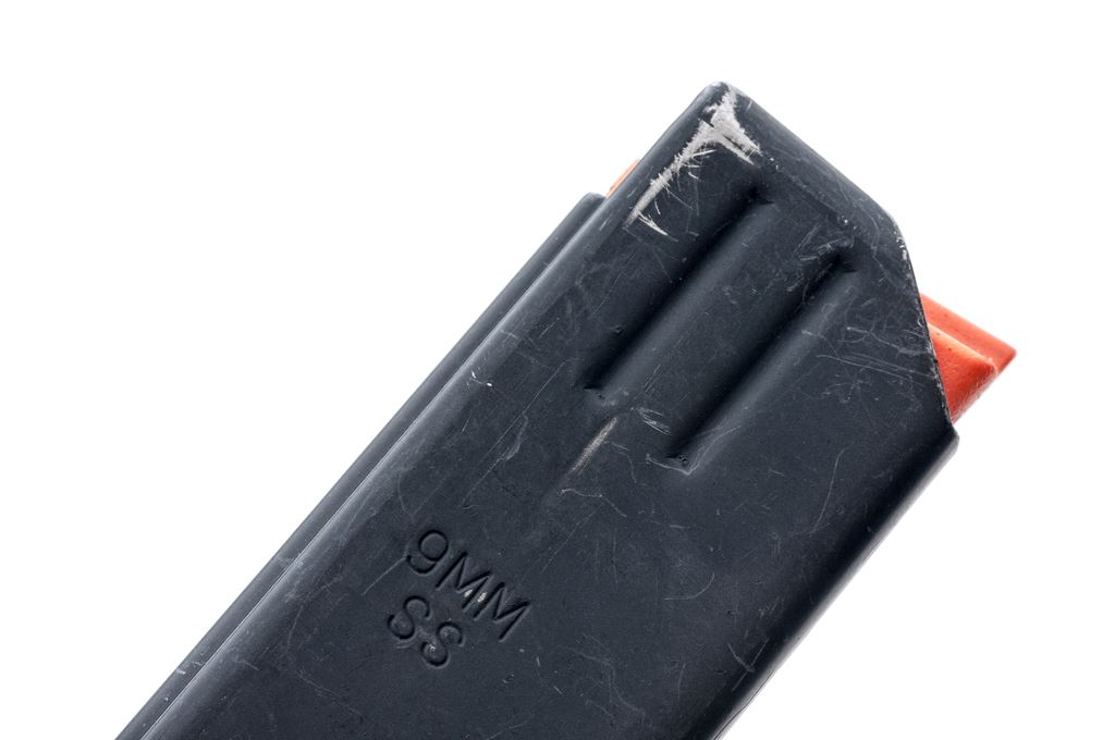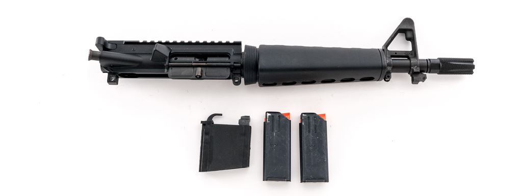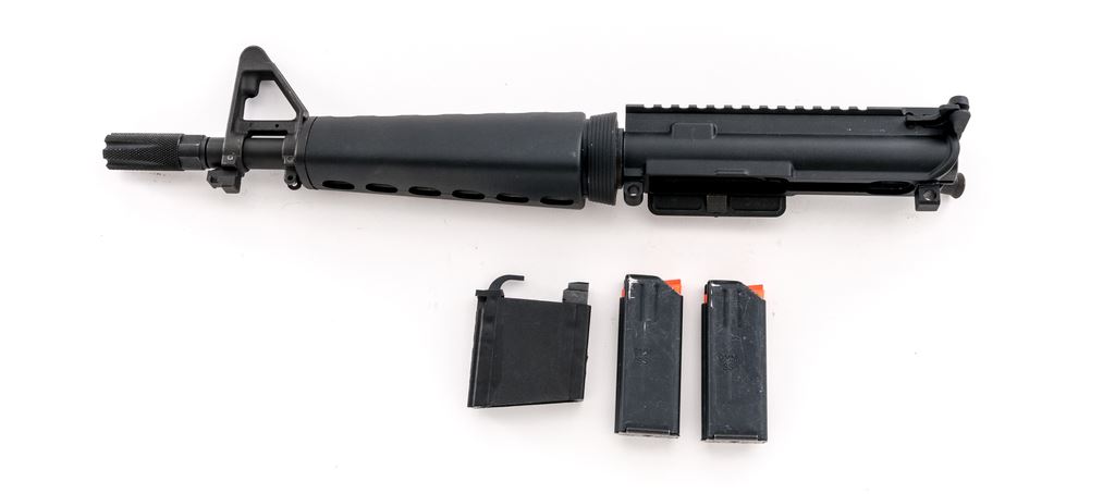 AR Style Pistol Upper, 9mm cal., with magazine adapter and two (2) 10-round A.S.C. 9mm magazines, matte black finish, 12.5'' overall barrel length, and includes the bolt. ''F'' marked front sight base; opposite side is marked ''2''. Condition is excellent. Handguard shows just light surface scuffs. Approx. 98% matte finish remains. Bright bore with excellent rifling. Est.: $300-$400.