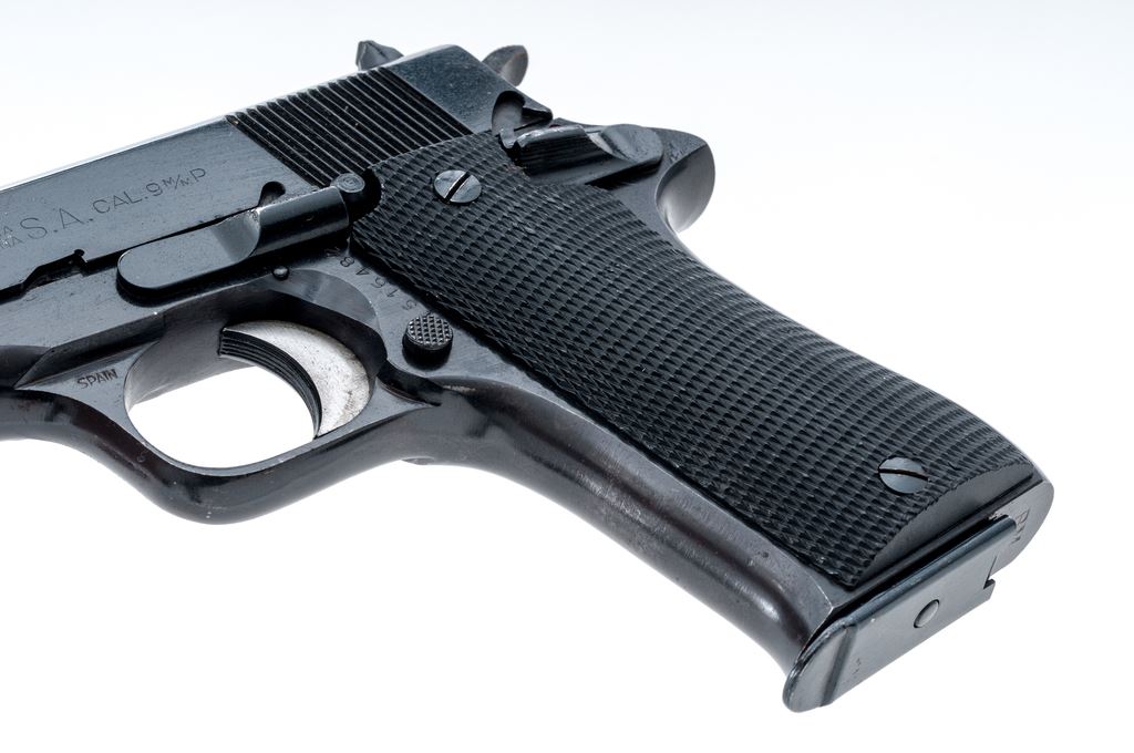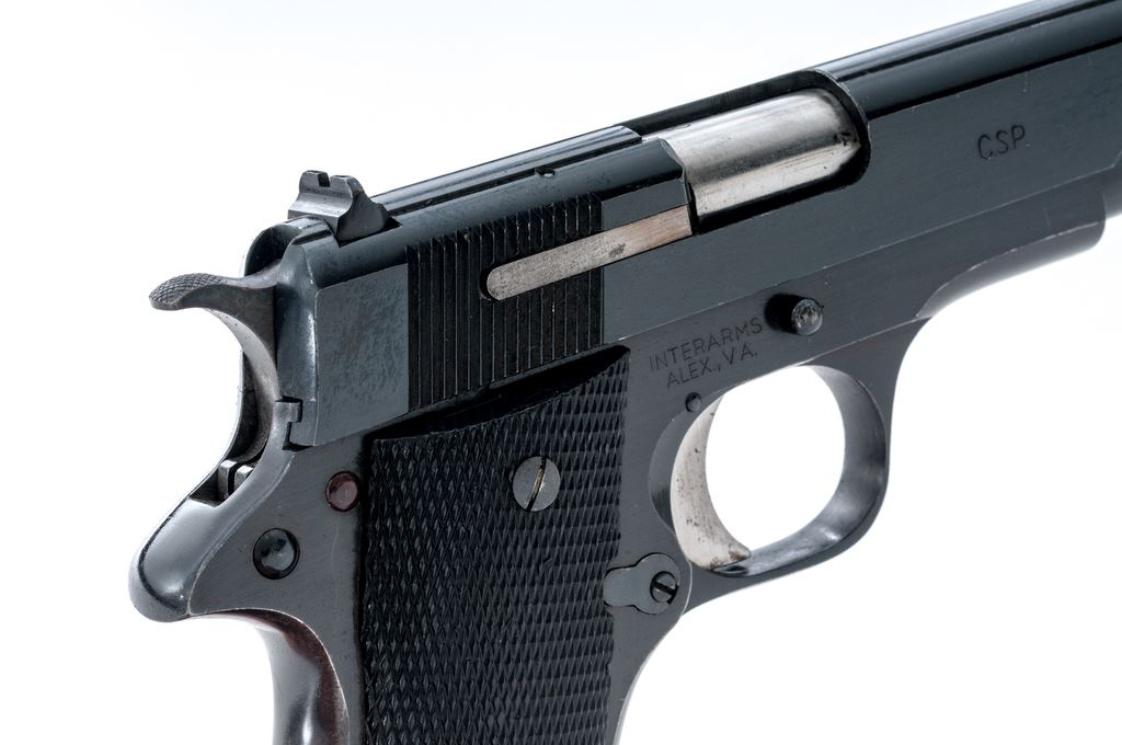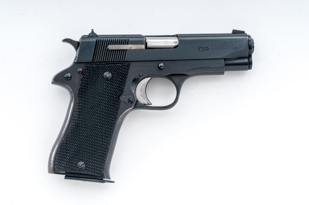 Police marked Star Model BM Semi-Automatic Pistol, #1516482, 9mm cal., 4'' barrel, blue finish, checkered black plastic grips, with standard sights, and one blued steel magazine. Marked on the bottom of grip frame ''BM''; right side of frame ''INTERARMS/ALEX, VA.'' Left side of slide with standard markings, right side is stamped ''C.S.P.'' Condition is very good retaining approx. 90% blue finish. Metal with scattered small handling marks, thinning to the front and backstrap account for most of the finish loss; factory lettering is clear. Grips show moderate handling wear, no chips or cracks. Smooth action, bright bore rates near excellent. Est.: $200-$350. (Modern/PPT)