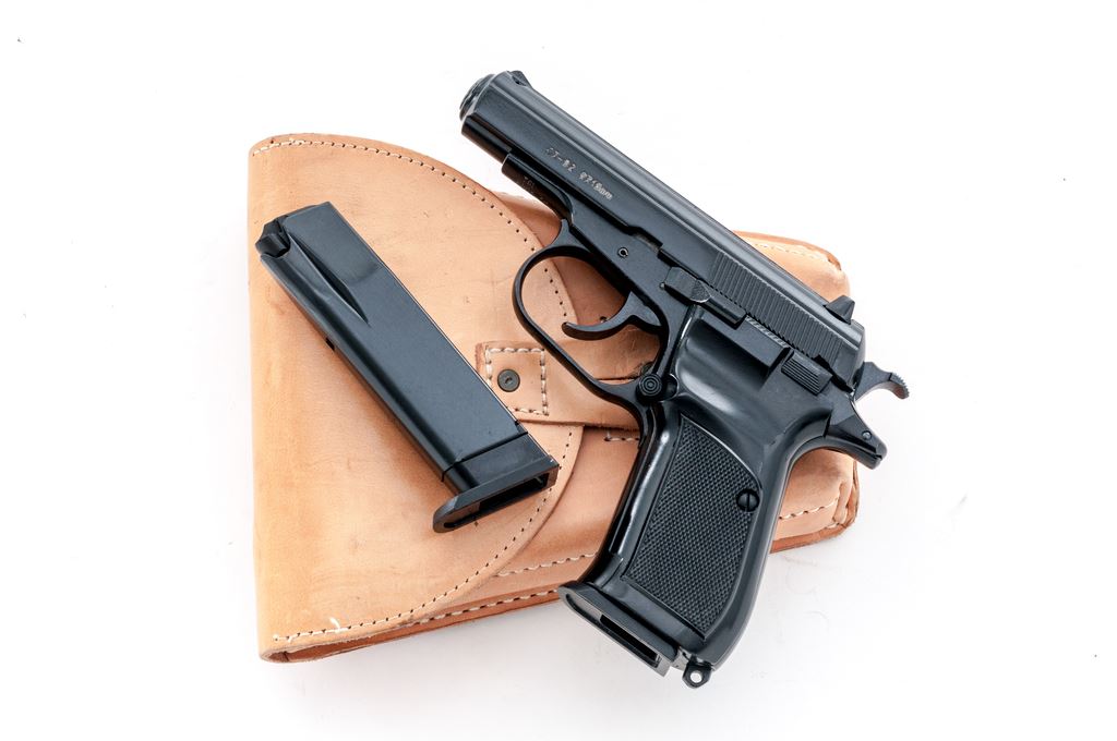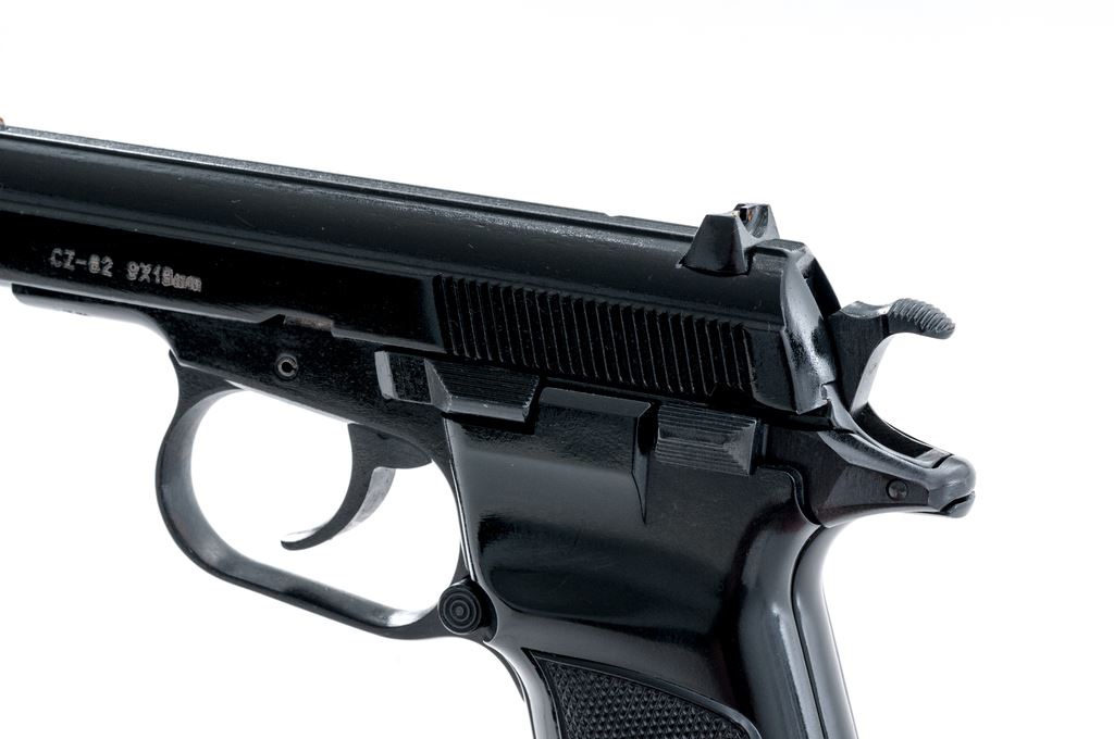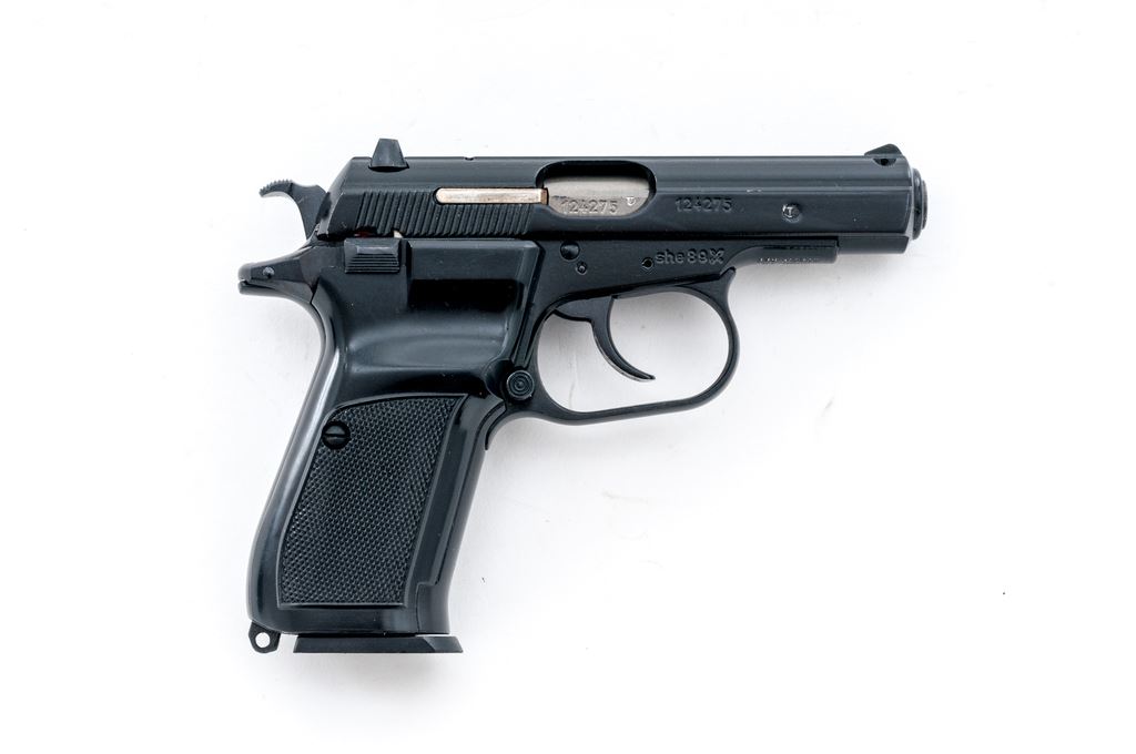 Czech CZ-82 Semi-Automatic Pistol, #124275, 9x18 Makarov cal., 3.8'' barrel, black finish, black plastic grips, blade front sight and notched rear sight. Marked on right side of frame ''SHE 89'' and engraved ''CZ-82 9 X 18'' on left side of slide. Includes two (2) 10-round magazines with black plastic bottoms. Condition overall is excellent retaining almost all of the finish on the metal that shows a few light handling marks. Grips are almost excellent with a few handling marks. Action is smooth, bright polygonal rifled bore is excellent. Import stamped on underside of frame. Includes a Czech tan leather holster and accessories in excellent condition. Est.: $200-$350. (Modern/PPT)