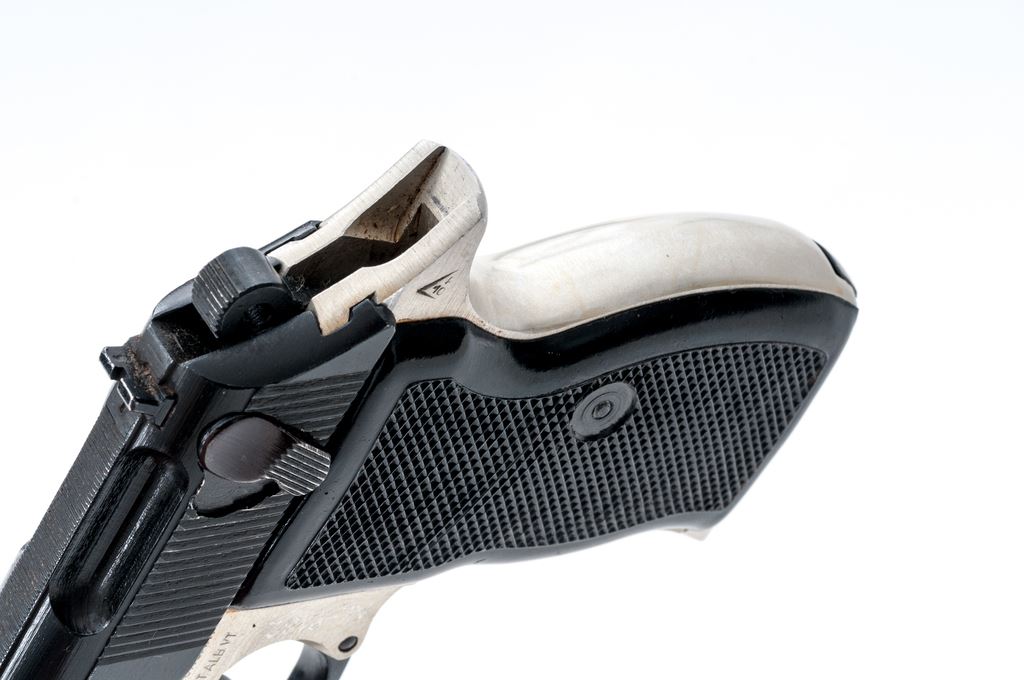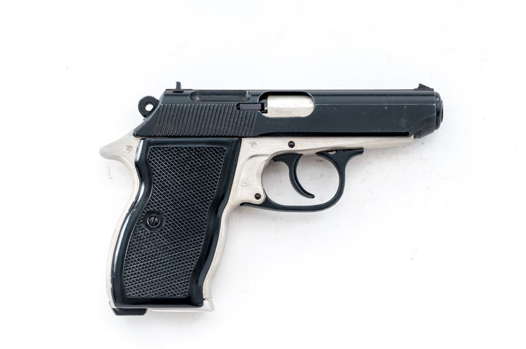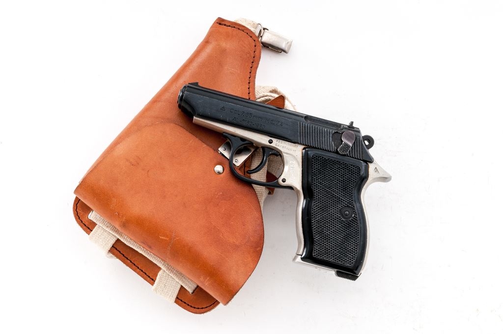 Hungarian FEG Model 74 Semi-Automatic Pistol, with holster, #AL-6182, .32 ACP cal., 3.5'' barrel, dark blue slide, aluminum frame, checkered black plastic grips, standard sights, with one magazine; magazine with a blued steel body, aluminum base, and is electro-penciled ''82'' to match the pistol. Left side of frame is import marked. Frame and slide with matching serial numbers; left side of the slide is also dated ''1980''. In a tan leather holster with shoulder straps and extra magazine pouch; inside flap is stamped ''Mdi'', ''IV/P, and ''MADE IN HUNGARY''. Condition is near excellent overall. Slide retains approx. 98% blue with a few slight handling marks to the metal. Grips with light handling marks to the smooth borders, right grip with a couple of small chips to the back inner edge. Smooth action, bright bore with excellent rifling. Holster is in fine overall condition showing only normal light scuffs and carry wear to the exterior. Est.: $150-$250. (Modern/PPT)