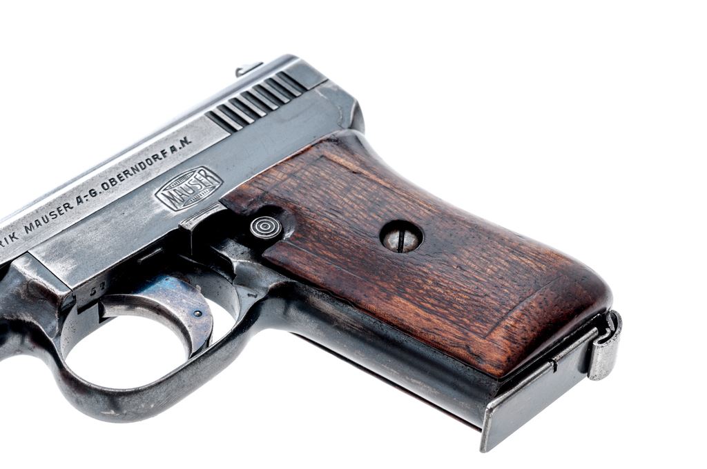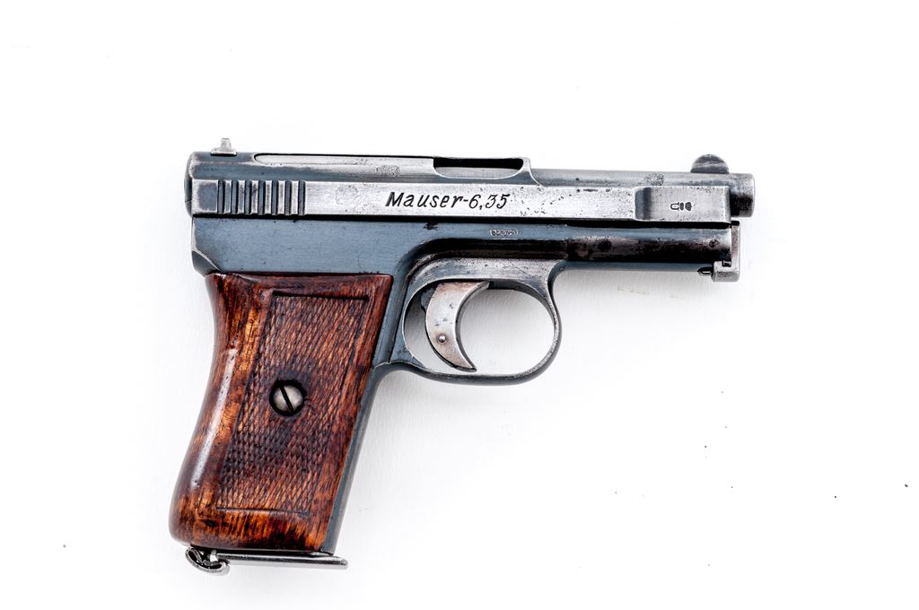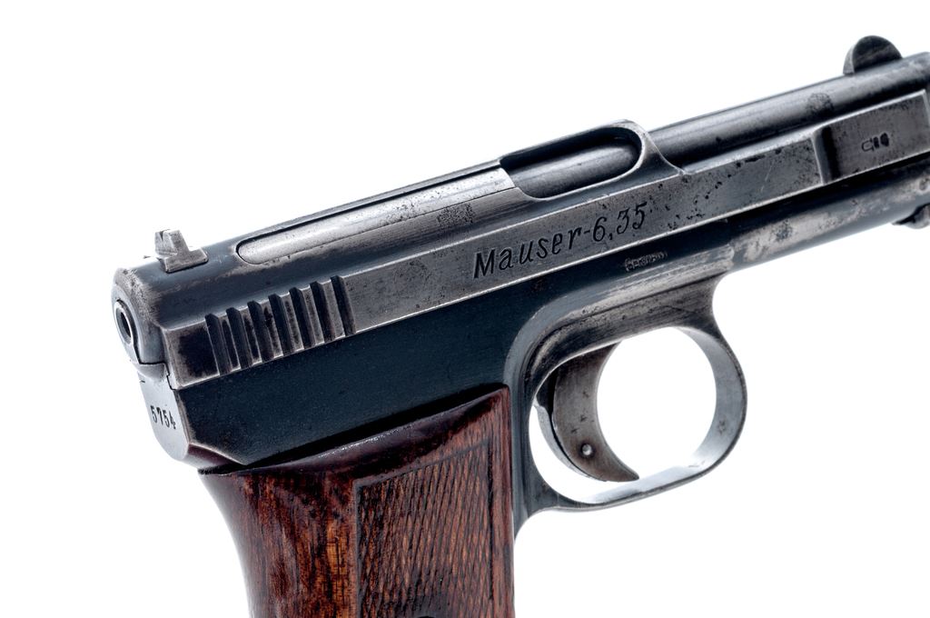 Mauser Model 1910 Semi-Automatic Pistol, #285754, .25 Auto cal., 3'' barrel, blue finish, wraparound pressed checkered walnut grips, with one factory magazine. Condition is good retaining approx. 50% original blue. Grips with moderate flattening, having smoothed and losing some of the checkering details. Good action, fair bore. Est.: $150-$300. (C&R/PPT)