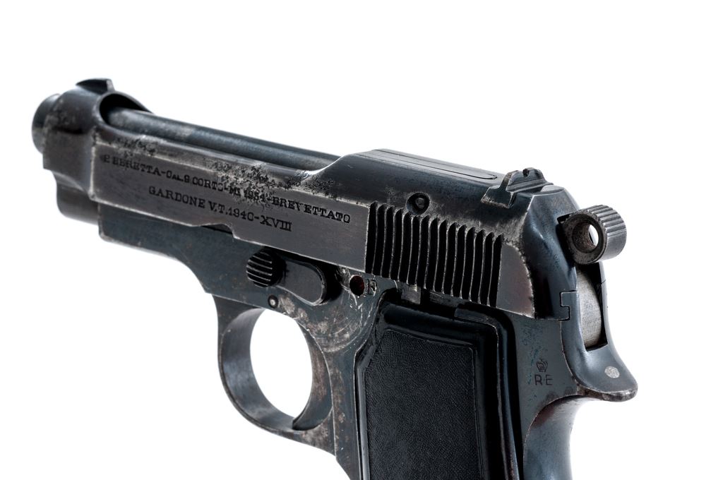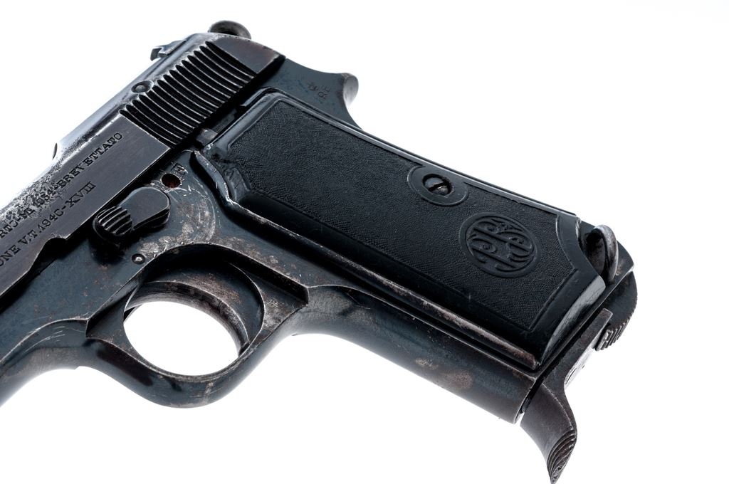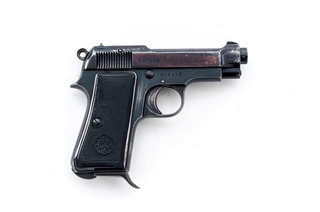 Beretta Model 1934 Semi-Automatic Pistol, #834298, .380 cal., 3.4'' barrel, blued finish, black plastic grips, fixed blade front sight and notched rear sight. Marked on left side of slide with standard model and address information including ''1940'' and ''XVIII''. Left side of frame stamped ''(crown)RE'', with one magazine. Condition overall is good with approx. 70% finish remaining on the metal showing areas of pitting on the left side of the slide, frame, and trigger. Grips are good with light chips and scratches. Action is smooth, bright bore is very good. No visible import marks. Est.: $250-$400. (C&R)
