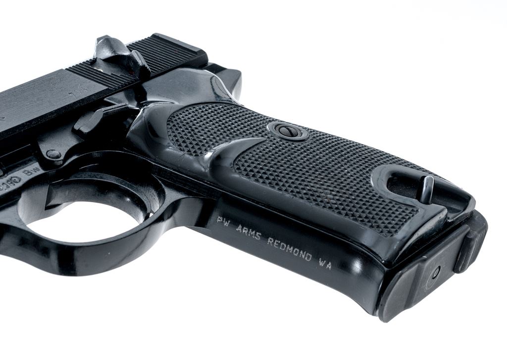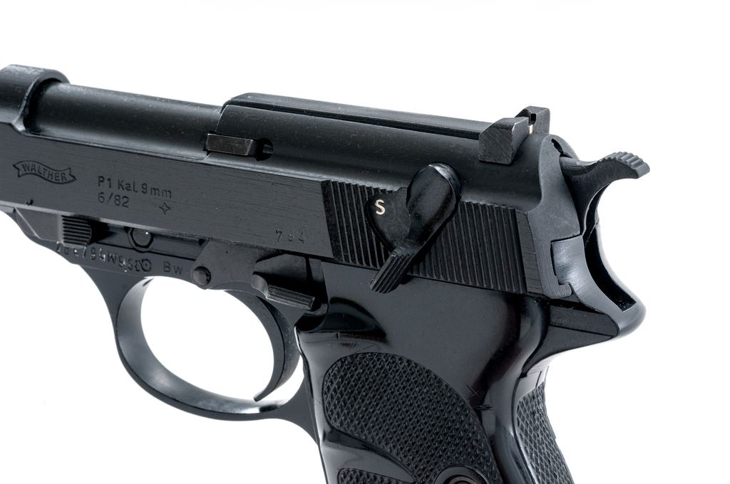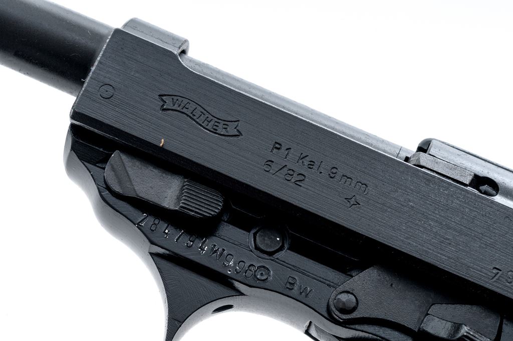 Walther P1 Semi-Automatic Pistol, #284794W, 9mm, 5'' barrel, matte barrel and slide; black aluminum frame, checkered black plastic grips, standard fixed sights, with one Walther ''P1'' marked magazine. Left side of slide is dated 6/82; left side of frame has the serial number and rework date of ''9.96'', as well as ''BW'' federal defense mark; ''(eagle)/413'' proofmarks can also be found on various parts of the pistol; front of grip frame is marked ''PW ARMS REDMOND WA''. Barrel, frame and slide with matching numbers. In fine overall condition. Approx. 97% finish remains, with muzzle wear and light scuffs to the matte surfaces accounting for a majority of the finish loss. Frame retains nearly all of its finish. Factory lettering, proofmarks, etc. are clear. Grips show moderate wear; checkering is mostly sharp. Action is smooth with an excellent bright bore. Est.: $300-$500. (C&R/PPT)