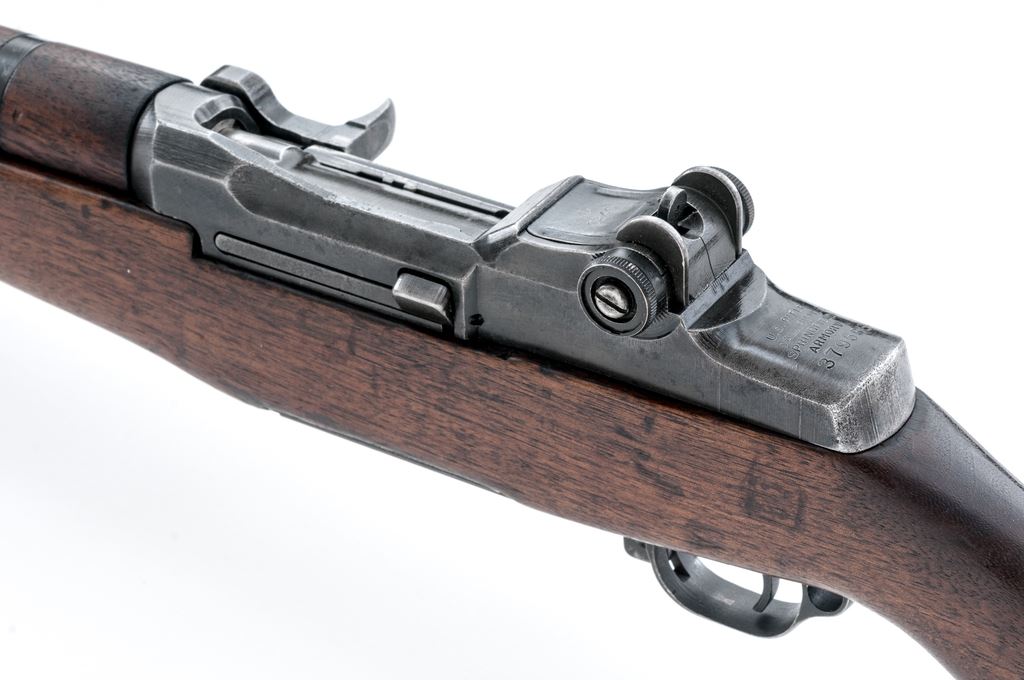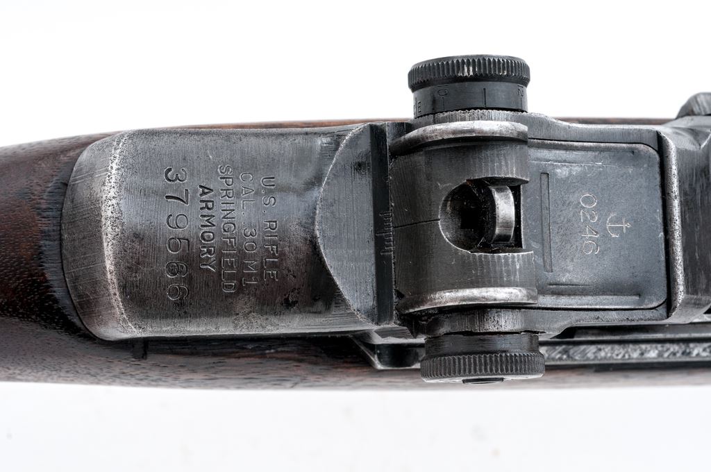 Springfield M1 Garand Semi-Automatic Rifle, #379566, .30-06 cal., 24'' barrel, parkerized finish, walnut stock, blade front sight with protecting ears and adjustable aperture rear sight. Marked on receiver tang ''U.S. Rifle cal. .30 M1 SPRINGFIELD ARMORY''. Barrel stamped ''HRA-4-52''. ''WRA'' marked operating rod. ''SA'' marked bolt, hammer, and triggerguard.'' ''PB'' marked trigger housing. Defense Dept. stamp on left side of stock. ''3162'' stamped in barrel channel, Circle ''P'' firing proof on underside of wrist. Rifle was purchased from the DCM and includes certificate, invoice, etc. Prior to that it was in Danish naval service and is engraved on top of sight cover with an ''(anchor)/0246''. Included is a U.S. M-10 cleaning rod in butt trap. Condition overall is very good with approx. 70% finish remaining on the metal, with the balance bright and scattered areas of old light pitting. Wood has been sanded and arsenal refinished over old handling marks. Action is smooth, bright bore is excellent with sharp rifling. No import stamps. In DCM shipping box. Est.: $900-$1,200. (C&R)