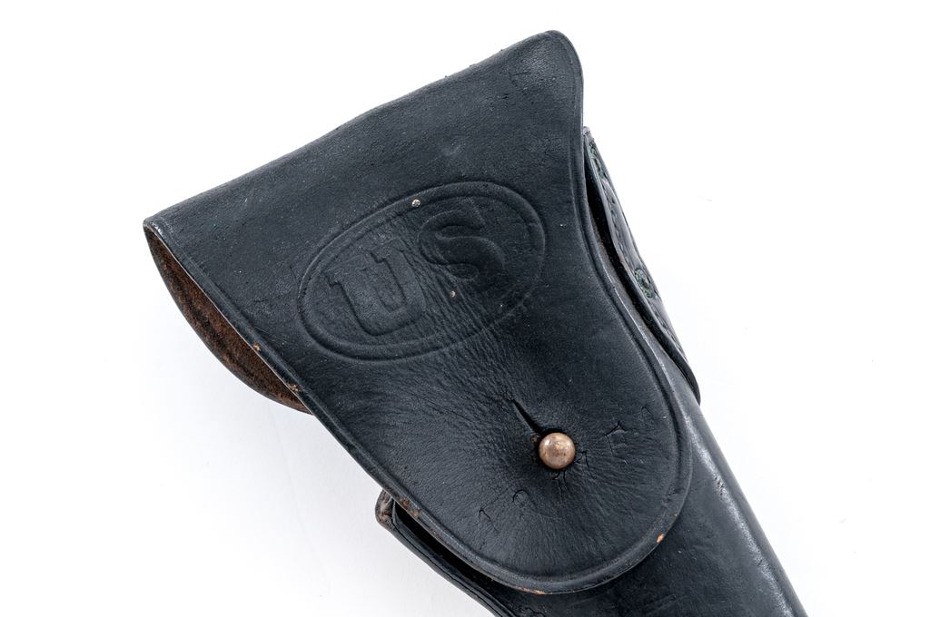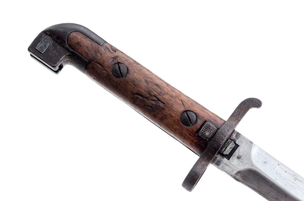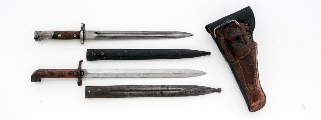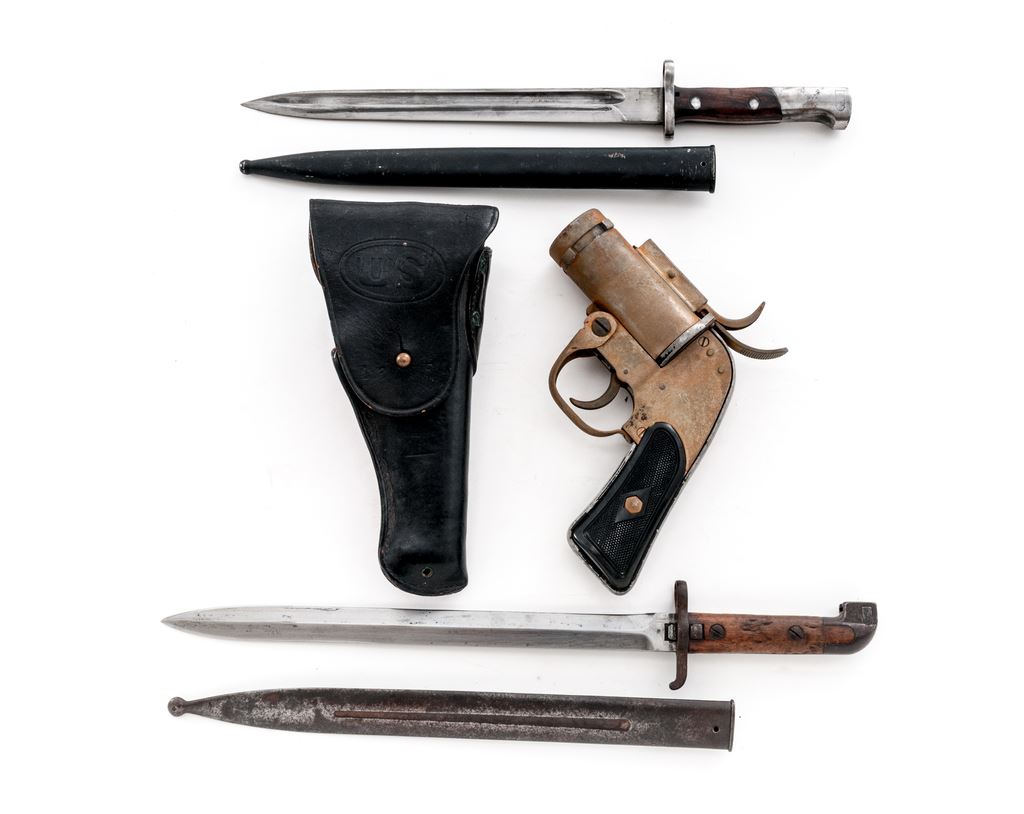 Lot of Two (2) Bayonets, WW1 U.S. Holster, and Flare Pistol: (1) The first bayonet is a Swedish Mauser M1894/14 type with 13'' double edged bright blade and an anchor proofmark on side of ricasso. Grip panels are wood with retaining screws. Scabbard is steel with a frog stud. Crossguard is marked ''I. 13 No. 114''. Condition is good with dents and dings to the wood grips, and scattered rust patina on the scabbard and metal of the handle. (2) The second bayonet is an unmarked Contract Mauser type with a 11-3/4'' blade that appears to have been shortened. Wood grips with screw retainers. Steel scabbard with a black painted finish. Muzzle ring diameter is approx. 3/4''. Condition is good, the blade and metal of the handle having been cleaned bright. Paint on scabbard is about 90%. (3) Holster is a WW1 era U.S. .45 Auto type with maker's mark on the back to ''Warren Leather Goods, 1917''. Front has been dyed black, but the rear remains brown leather, with brass belt loop. Front flap marked with ''US'' in oval, showing faint stamped unit markings that read ''A 311 F''. Condition is good with some crazing to leather and some light verdigris around the brass rivets, belt loop, and stud. 4.) WWII Eureka Vacuum Cleaner Co. U.S. M-8 Flare Pistol, 37mm, metal with aluminum grip frame, checkered black plastic grips. Right side of the frame is marked inside of a triangle ''EVCC/1942/U.S. PROPERTY/PISTOL PYROTECHNIC M-8''. Condition is good. Metal with a mostly yellow hue with areas of frosted surface rust and patches of moderate corrosion; thorough cleaning would improve the overall condition. Left grip with a hairline crack along the front edge and both are otherwise very good. Action needs repair, bore with patches of surface rust and corrosion. Est.: $250-$350/lot.