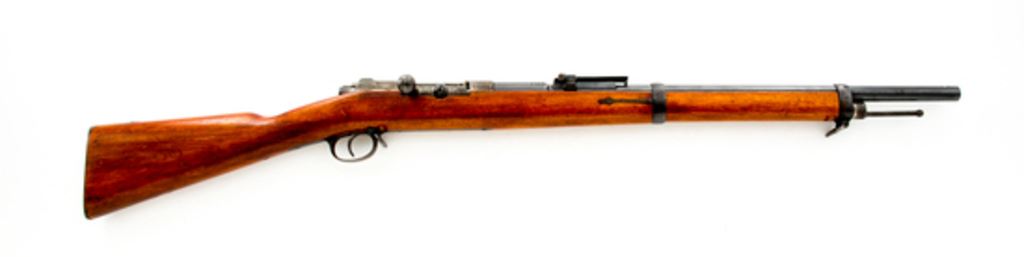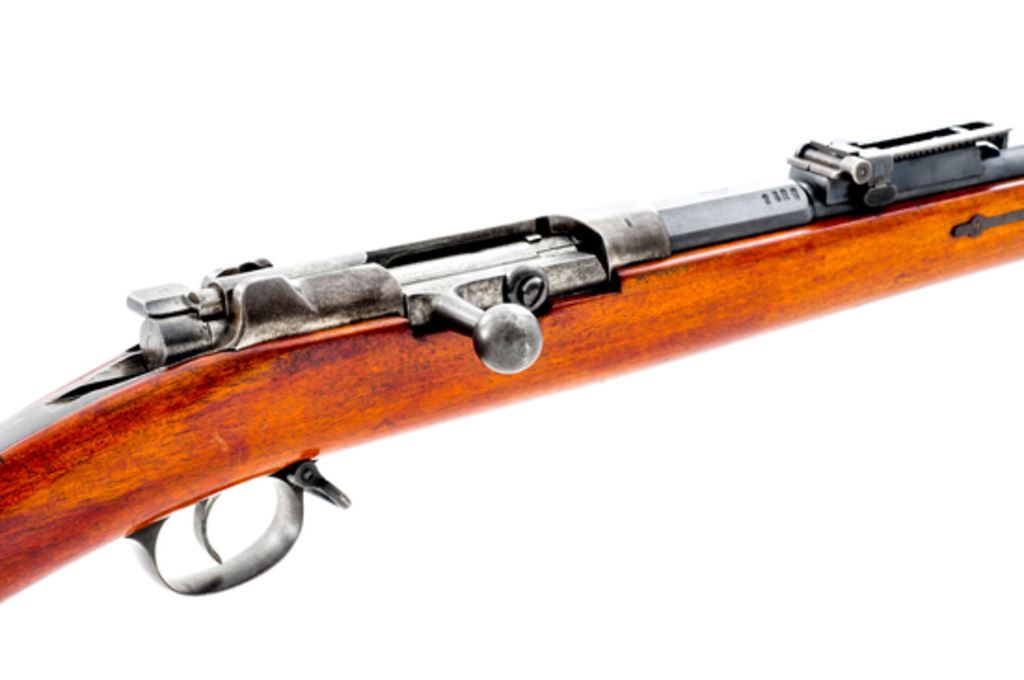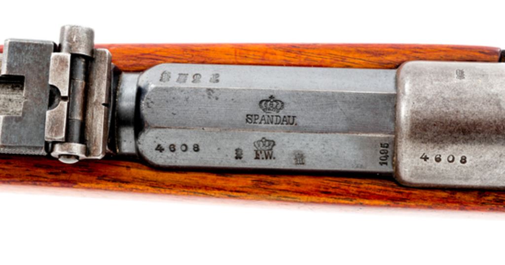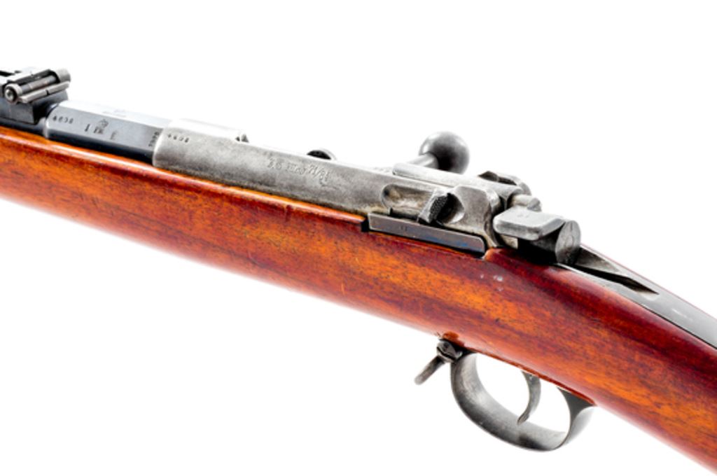 Shortened M71/84mm Mauser Bolt Action Rifle, #4608, 11mm Mauser cal. (stamped 10.95 on barrel), barrel has been shortened to 22.9'', blued finish, hardwood stock, front sight removed, adjustable leaf folding rear sight. Stamped on left side of receiver ''I.G MOD 71/84'', no date on right side. ''(Crown)/SPANDAU'' on chamber flat; ''(crown)/F.W.'' on left side. Unit numbers on buttplate tang ''37.R/1.241''. Faint cartouches on stock. Rifle has been sporterized by shortening barrel. Notch has been cut for front sight but sight is not fitted. Mismatched numbers on bolt assembly. Condition overall is very good with over 80% finish remaining on metal surfaces with fading on action and buttplate. Stock has been sanded and refinished with a gloss varnish showing handling marks overall. Bore has a few small areas of pitting, otherwise very good with strong rifling. The action and cartridge lifter operate smoothly. Est.: $300-$450. (Antique)