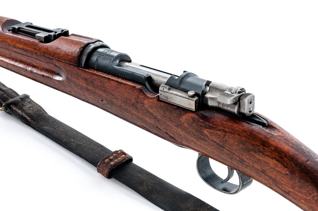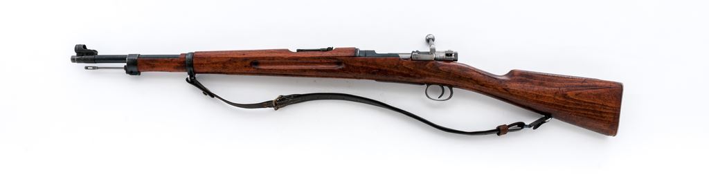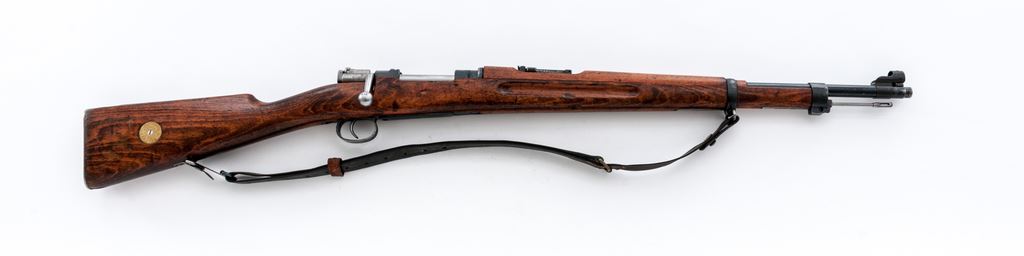Swedish M38 Mauser Bolt Action Rifle, #605967, 6.5x55mm cal., 23.6'' barrel, blued/bright finish, hardwood stock, blade front sight with attached protective hood and adjustable folding leaf rear sight. Marked on receiver ring ''HUSQVARNA VAPENFABRIKS AKTIEBOLAG''. Brass bore condition disc and remnants of range decal on right side of buttstock. Bolt handle has been re-numbered to match, rear band is mismatched. Includes cleaning rod. Condition overall is very good with over 80% finish remaining on metal surfaces. Wood is very good with applied varnish over old handling marks and scratches. Action is smooth, bright bore is very good. Import stamped on right side of barrel. A good condition Swedish leather sling is attached. Est.: $300-$450. (C&R)
