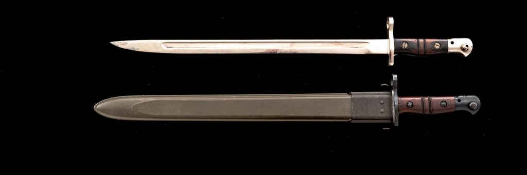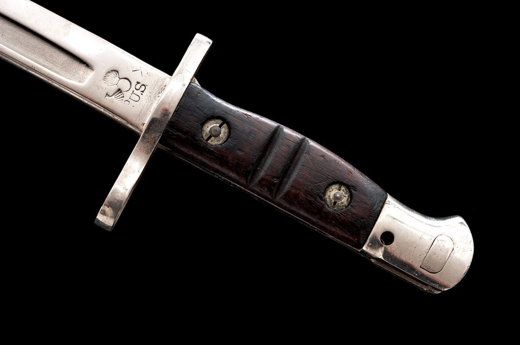 Lot of Two (2) U.S. M-1917 Bayonets, both stamped ''(flaming bomb)/U.S'' and ''1917 REMINGTON'' on ricasso: 1.) Condition of bayonet is about excellent with a couple of small patina spots to pommel and edge of blade. Tiny nicks to blade and grips. Plastic scabbard is marked ''U.S.-M1917 B.M.CO.'' and is in good condition, with closed crack to bottom and light patina to locket. 2.) Bayonet has been chromed for ceremonial use. Condition is good with areas of flaking to the finish and handling marks on the grips. No scabbard. Est.: $200-$300/lot.