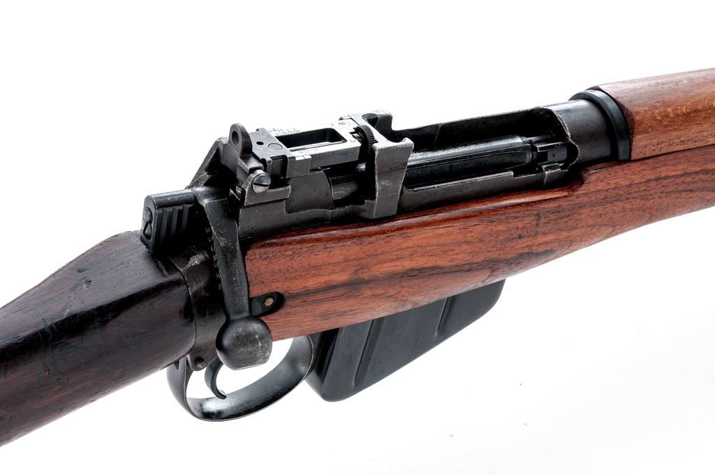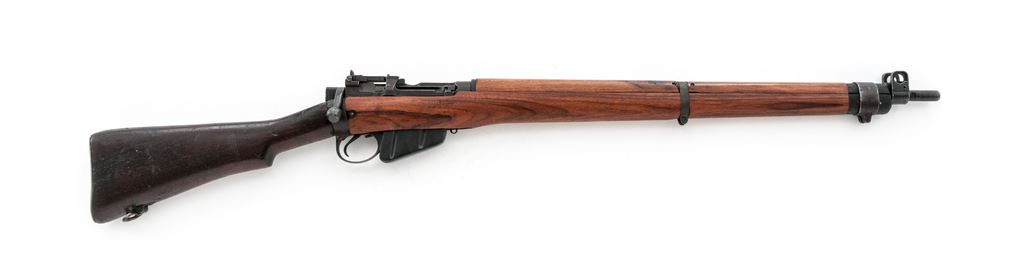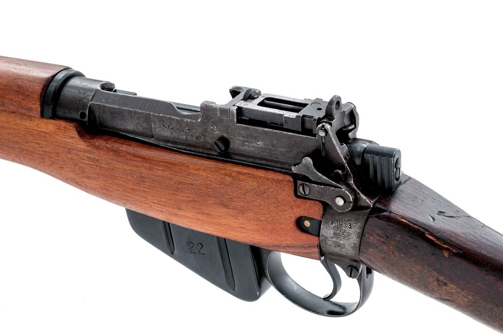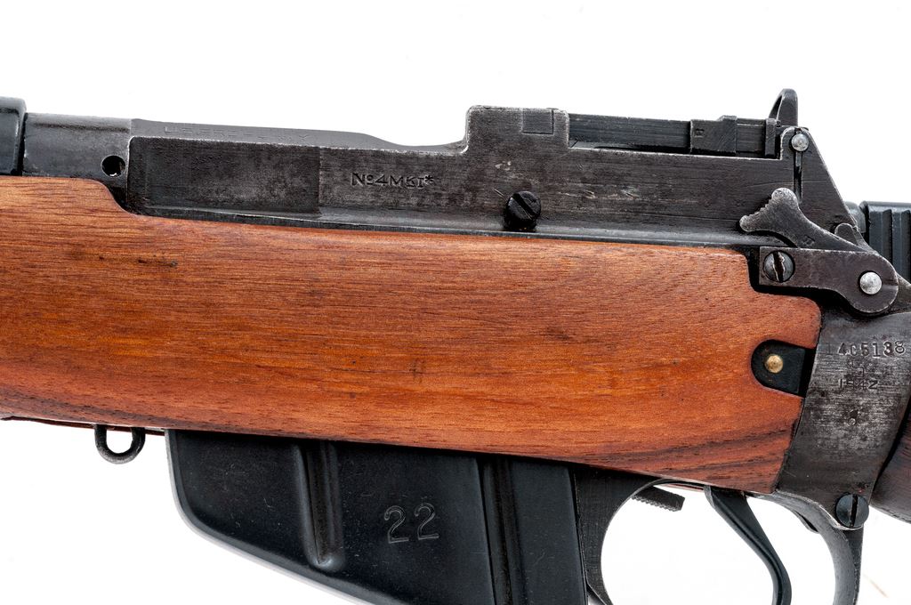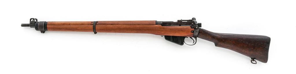 British No. 4 Mk 1* Lee-Enfield Bolt Action Rifle, #14C5138, .303 British cal., 25.2'' barrel, blued/parkerized finish, hardwood stock, front sight blade missing, front sight block and protectors are present, with folding leaf rear sight. Marked on left side of receiver ''No4 Mk1*/U.S.PROPERTY/S/1942''. ''No.2 bolt head 22'' stamped on magazine. Mismatched number on bolt handle. Forend, handguards, and rear band are replacements. Condition overall is very good with approx. 75% finish remaining on the metal. Forend and handguards are excellent. Buttstock is very good showing darkness and handling marks. Action is smooth; two-groove bore is very good with some darkness near the muzzle. Import stamped on top of barrel. Est.: $300-$450. (C&R)